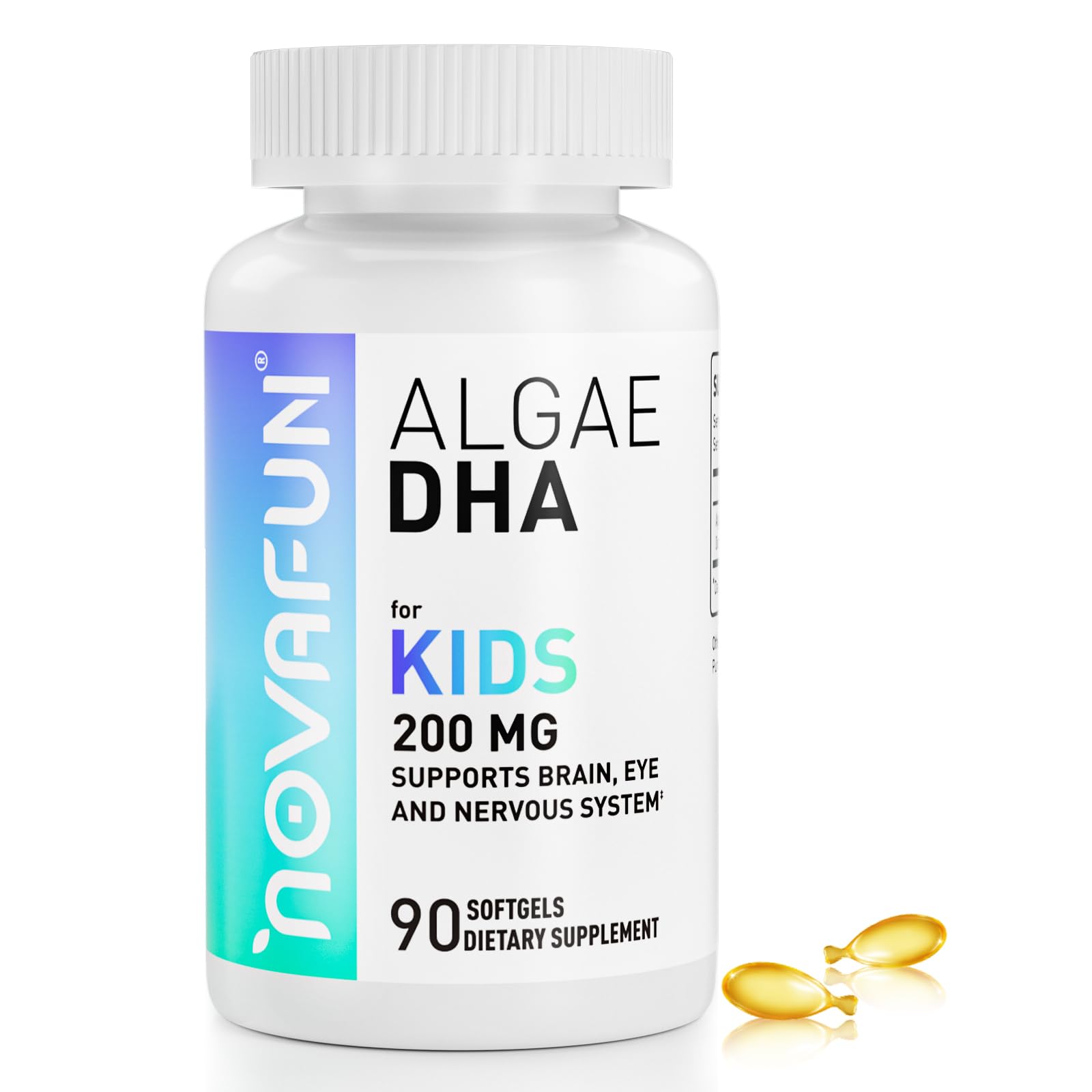 Novafun Algal Sourced Omega-3 & DHA Softgels for Kids Brain Eye and Heart Health Cognitive & Immune Function Learning Social Development - Non-GMO - 200 mg - 45 Day Supply - 90 ct