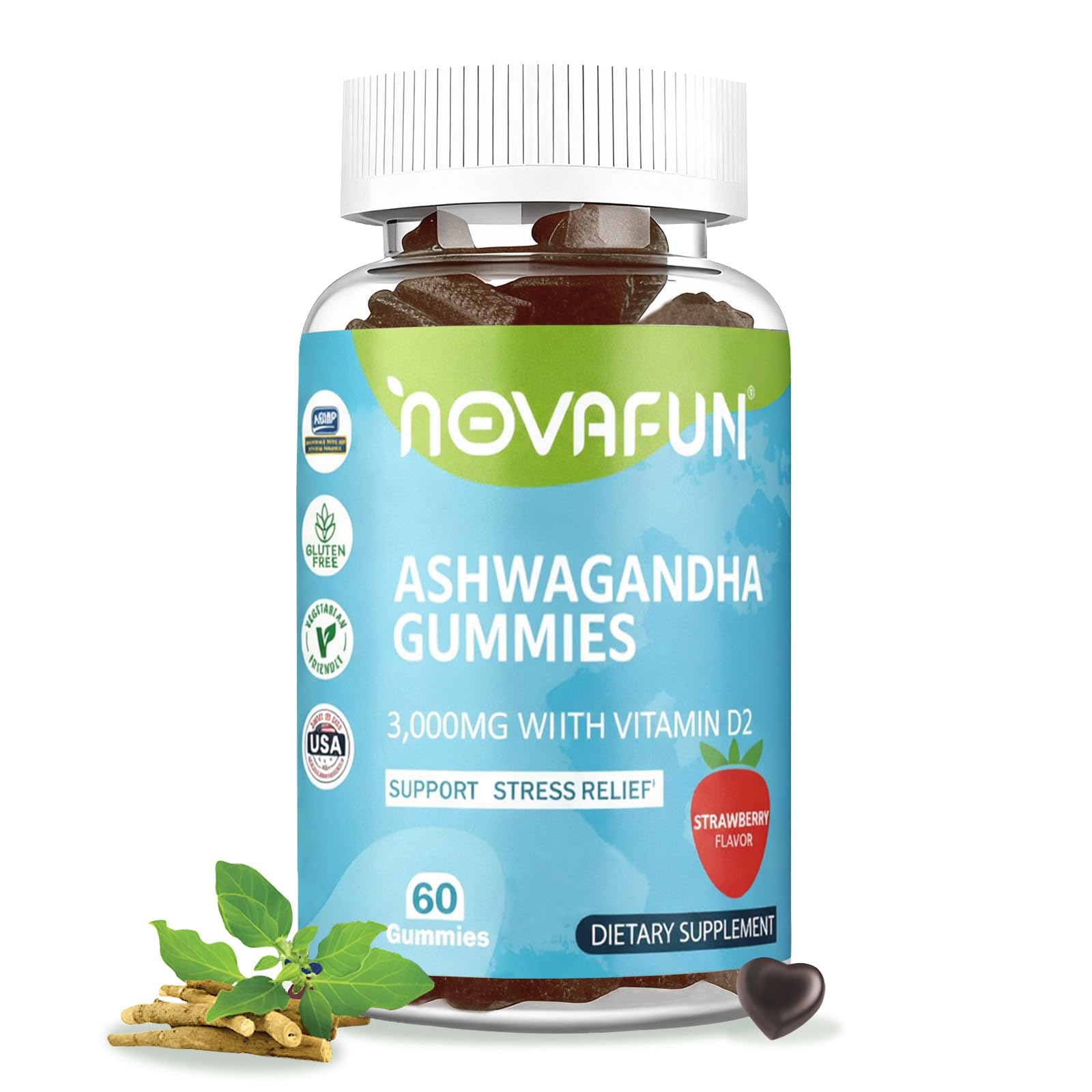 Novafun Ashwagandha Gummies for men contain 3000 mg of ashwagandha and 25 mcg of vitamin D2 per serving to relieve stress and support immune health and overall well-being. With 60 strawberry-flavored gummies per bottle, Novafun provides a month's worth of natural stress support in a convenient and delicious format.