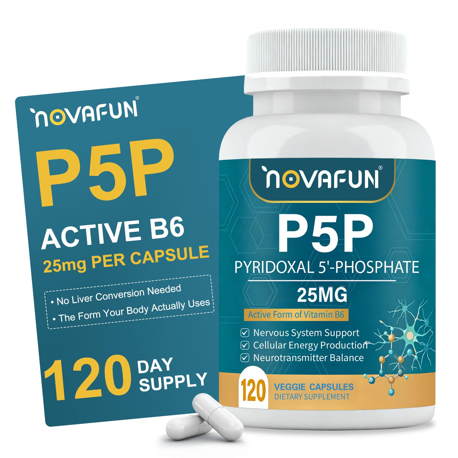 Made in USA, Trust Quality: Novafun P5P capsules are manufactured in a cGMP certified facility in the USA and tested by third parties for purity, quality and potency. Clean ingredients, Non-GMO, Gluten-free, No artificial additives. Heart Cyclical Health: P5P vitamin b6 supports healthy homocysteine levels, which is important for overall Heart health. Additionally, it is widely used by women to promote hormonal balance and support general female wellness. Cellular Energy Production: Fuel your day. P5P supplement drives energy production by efficiently converting proteins, carbohydrates, and fats into usable cellular fuel. Essential for combating daily fatigue and promoting sustained energy levels. Neurotransmitter Balance Nervous System: Dual-action support. P5P 25mg aids synthesis of Serotonin, Dopamine GABA, promoting cognitive clarity and focus. It also maintains nerve cell health and supports efficient signal transmission for a robust nervous system. Active Coenzyme B6: Unlike regular Vitamin B6 (Pyridoxine HCl), our P5P (pyridoxal-5-phosphate) is the ready-to-use coenzyme form. It bypasses the liver conversion process, delivering high bioavailability. Ideal for users who struggle to efficiently utilize standard Vitamin B6.