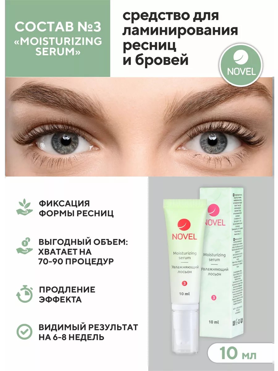 Набор профессиональной косметики 3 в 1 Novel включает три состава для ламинирования. Здесь представлен 3-й Этап для долговременной укладки - увлажняющая сыворотка для ресниц и бровей