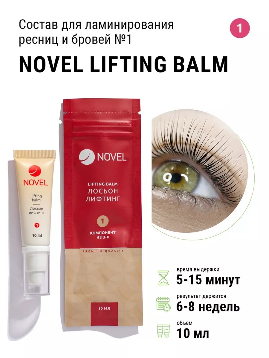 Состав для первой экспозиции в ламинировании ресниц.Размягчает кутикулу ресницы, придает ресничному волосу новую форму на 6-8 недель.Уникальность формулы лифтинг бальзама Novel Lash Up в содержании протеинов шелка низкой молекулярной массы. Во время реакции протеины шелка создают на поверхности ресницы защитную пленку. Благодаря этому, восполняется объем ресничного волоса и уровень влаги.После ламинирования препаратами Novel Lash Up ресницы вашего клиента будут здоровыми, увлажненными и плотными.Лифтинг бальзам Novel Lash Up имеет приятный воздушный аромат свежести, который понравится вам и вашему клиенту. Novel Lash Up дарит комфортную процедуру без резких запахов.Консистенция препарата - белый нежный крем. Благодаря насыщенному белому цвету состава, вы будете отчетливо видеть зону нанесения.Время выдержки состава на ресницах от 5 до 15 минут в зависимости от типа ресниц.Объема 10 мл. хватит на 70-80 процедур.