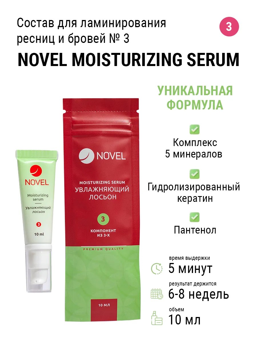 | Комплектация | Состав для ламинирования ресниц и бровей 3 - Увлажняющая сыворотка Novel - 1 шт - 10 мл. |