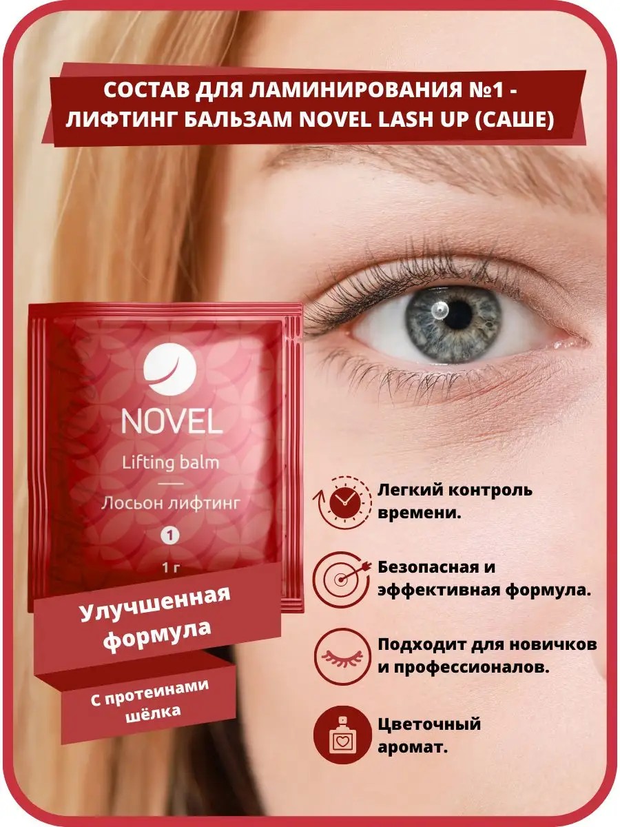 NOVEL offers professional-grade products, formulas, and tools. A limited-edition promotional set of 3 sachets for eyelash and eyebrow lamination is just the thing to dispel your doubts. See how gently the formulas work, what a vibrant curl you get, and how moisturized and healthy your lashes are after the Novel Lash Up procedure. You can spend hours reading thousands of reviews online and trust the opinions of people whose level of expertise you don't even know. Or you can try what interests you and form your own opinion based on your own experience. After testing Novel's formulas, you'll understand: The consistency of the liquids; how evenly they apply; the rich, bright white color, making it easy to control the application area; the scent; the ease and safety of the processing time; and the vibrant curl you get. The set includes: Lifting Balm (1 g), Volumizing Fixer (1 g), and Moisturizing Serum (1 g). The eyelash lamination kit is an innovative eyelash care method that allows you to achieve luxurious volume and deep color. Eyelash lamination is a process that strengthens and moisturizes eyelashes, giving them a healthy, radiant appearance. These innovative products are designed to care for and enhance your eyelashes. Specialized lamination formulas from Novel contain unique active ingredients that nourish, strengthen, and protect your lashes. They improve the structure of the hairs, making them thicker, stronger, and more elastic. Novel lamination formulas are highly effective and provide long-lasting results. They will help you create the perfect curl and volume for your lashes, making your look more attractive and vibrant. Choose natural lamination formulas from Novel and give your lashes beautiful and healthy looks. Enjoy professional care and high-quality results with Novel lamination products.