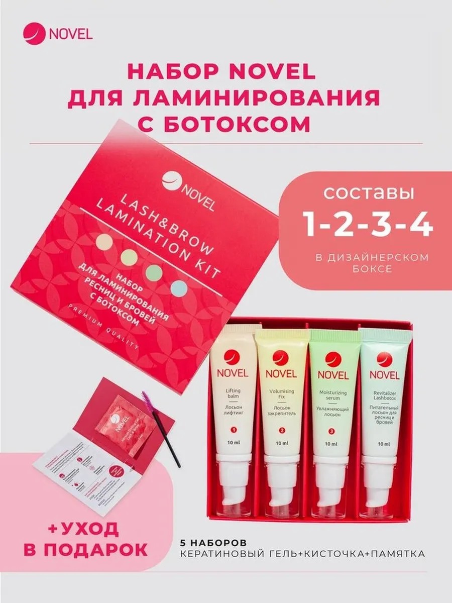 NOVEL Набор Составов для ламинирования ресниц и бровей 4х10мл (с ботоксом) + 5саше Кератинового Геля Keratin Styling Gel Lash&Brow.