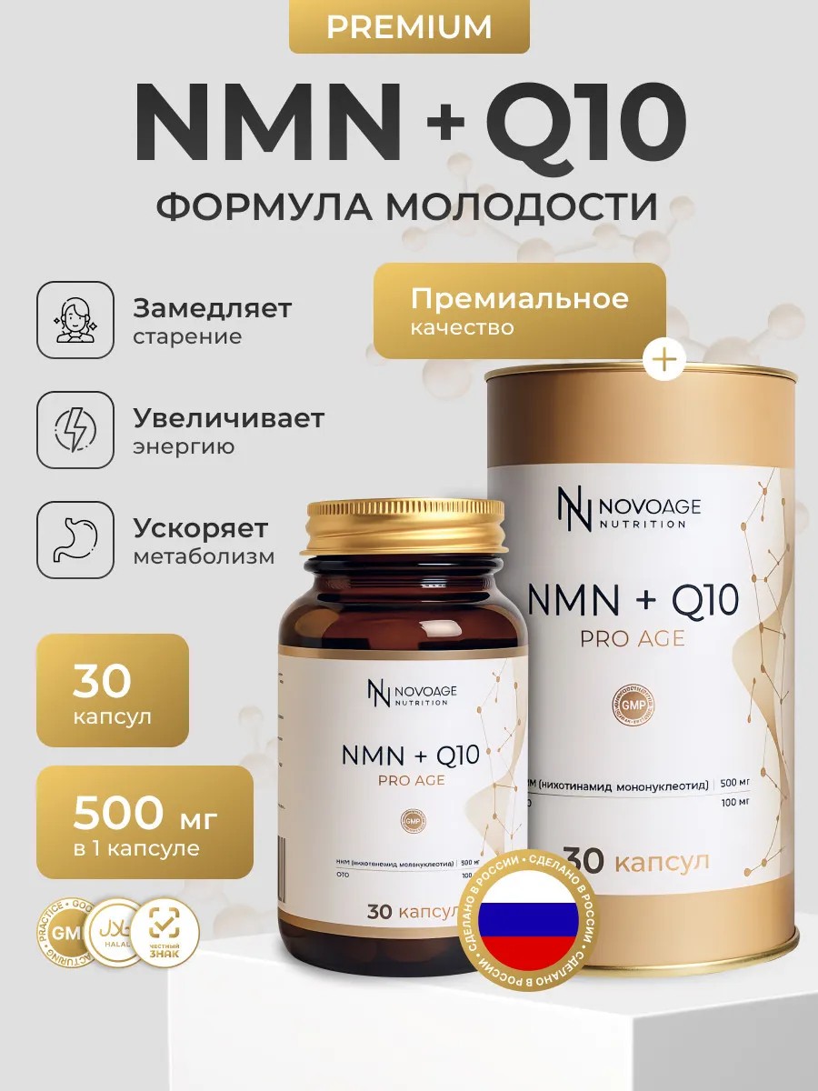 | Состав | NMN (никотинамид мононуклеотид); Q10 (коэнзим); желатиновая капсула |