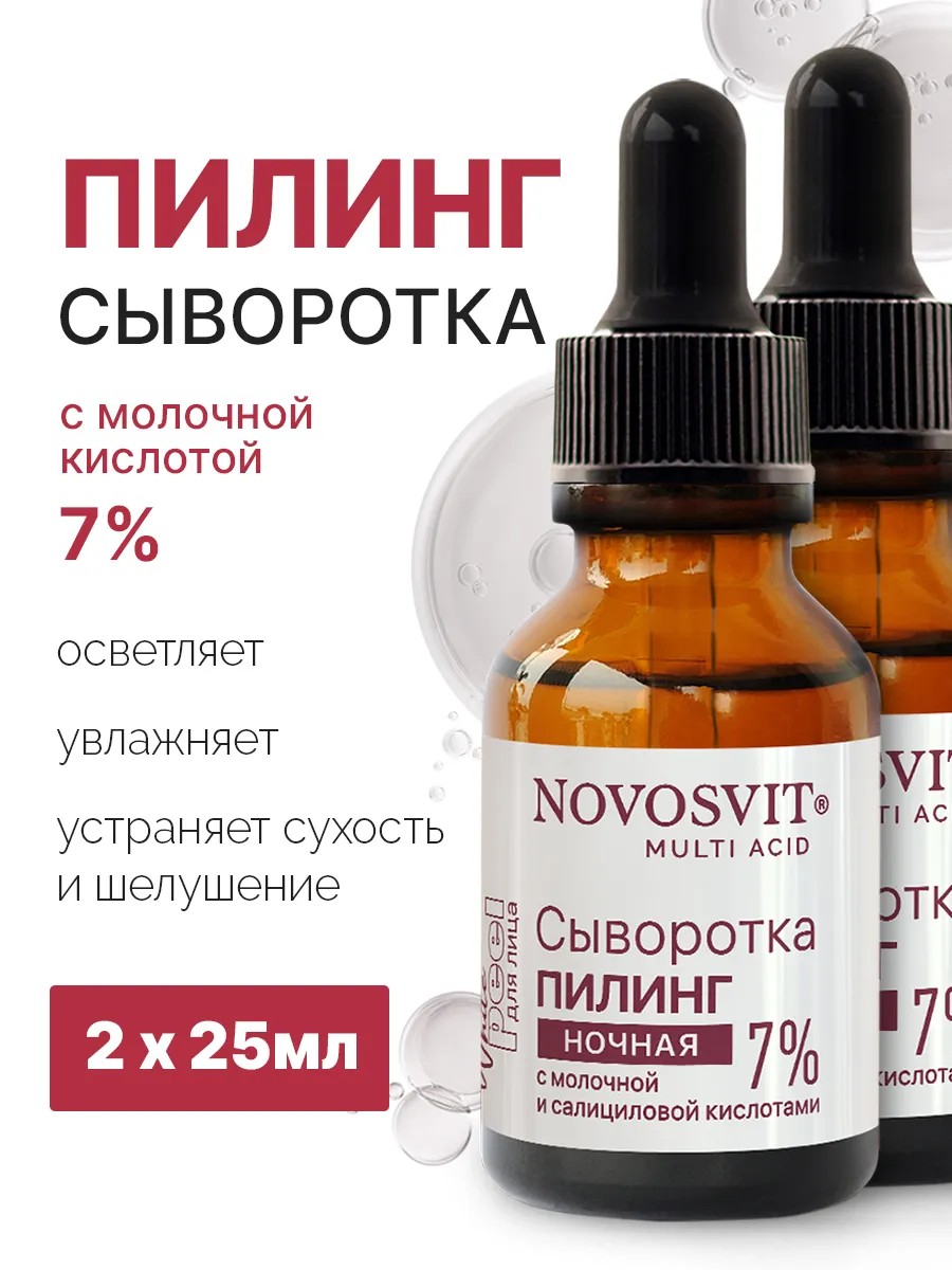 Погрузитесь в мир красоты с уникальным пилингом для лица от NOVOSVIT! Эта сыворотка с АНА и ВНА кислотами не только мгновенно тонизирует кожу, но и постепенно осветляет, упругость и эластичность кожи. Молочная кислота увлажняет и разглаживает, а салициловая глубоко очищает поры и борется с прыщами. Просто нанесите перед сном и утром ваша кожа будет сиять здоровьем. Этот пилинг - настоящее открытие для вашего ухода за кожей, дарящее ей молодость и свежесть.\n\nПилинг для лица от NOVOSVIT - это профессиональный косметический продукт, который поможет омолодить вашу кожу, делая ее свежей и сияющей. Это всесезонный продукт, который можно использовать в любое время года. Он идеально подходит для сухой и жирной кожи, помогая отшелушивать ороговевшие клетки и улучшая общее состояние кожи. \n\nСыворотка для лица \serum\ от NOVOSVIT, обогащенная BHA кислотами, глубоко проникает в поры, обеспечивая профессиональное кислотное пилинг-действие прямо у вас дома. Этот продукт является одним из ходовых в линейке косметики для лица NOVOSVIT, что говорит о его высоком качестве и эффективности. \n\nСодержащая 2% салициловой кислоты, эта сыворотка обеспечивает глубокое очищение и отшелушивание, помогая бороться с прыщами и комедонами. Она также эффективно борется с пигментными пятнами, делая вашу кожу более равномерной и сияющей. \n\nHL косметика для лица от NOVOSVIT - это натуральный и лечебный продукт, который поможет вам бороться с проблемной кожей, устраняя пигментные пятна и делая вашу кожу более здоровой. Он также может быть использован как домашний пилинг, что делает его очень удобным в использовании. \n\nПилинг для лица от NOVOSVIT - это ваш шаг к здоровой и сияющей коже!