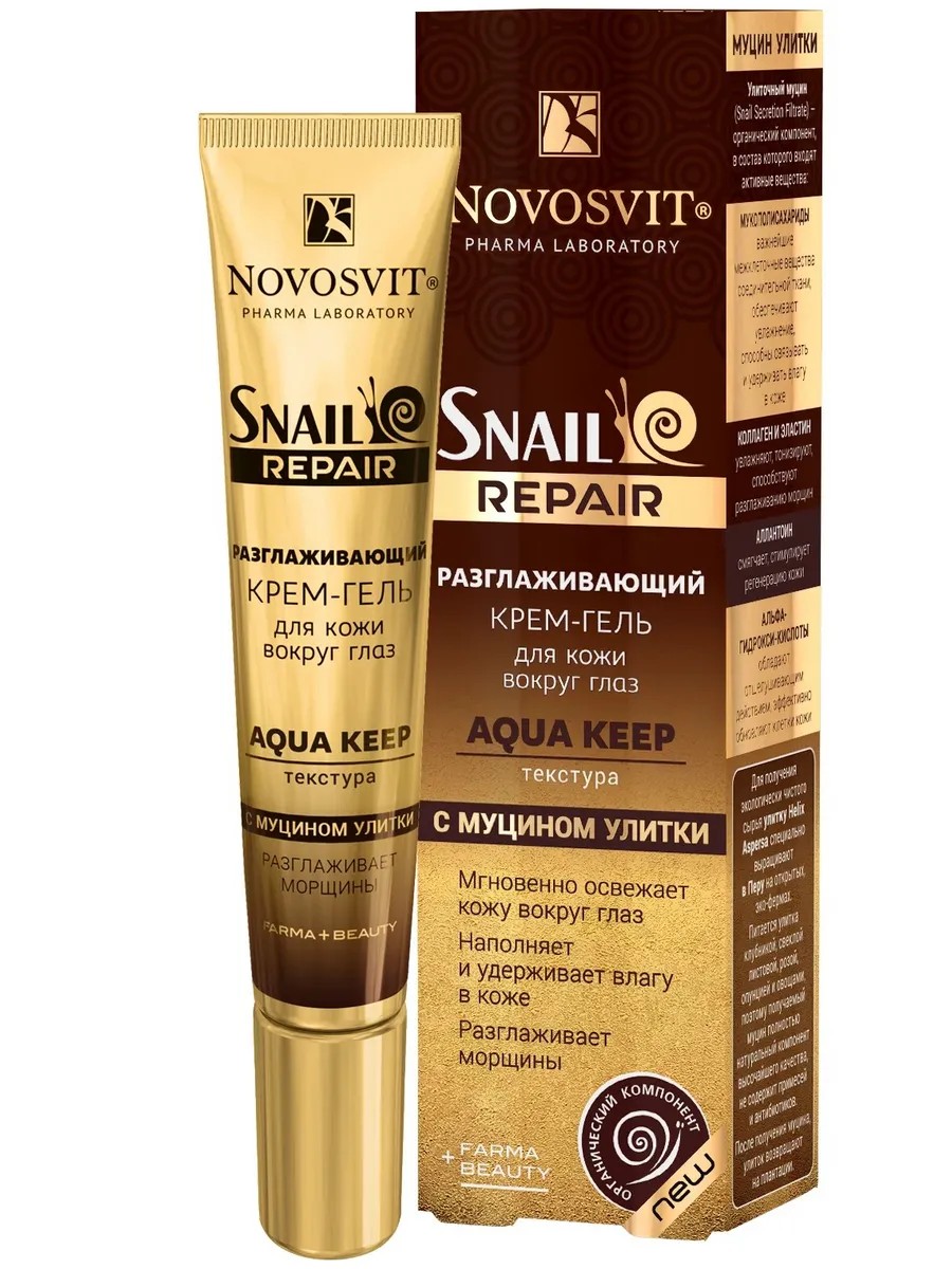 NOVOSVIT Aqua Keep Smoothing Eye Cream-Gel with Snail Mucin, 20 ml (NP / NS - 5506). Aqua Keep Eye Cream-Gel instantly moisturizes and refreshes delicate skin, visibly improves its condition, retains moisture, increases firmness and elasticity, and helps smooth out wrinkles. - 100% snail mucin - melting texture - intense hydration - wrinkle smoothing - restoring skin smoothness Ingredients: Aqua (Water), Snail Secretion Filtrate, Glycerin, Sodium Acrylates Copolymer, Lecithin, Triticum Vulgare (Wheat Germ) Oil, Zea Mays (Corn) Oil, Isopropyl Isostearate, Isohexadecane, Polymethylsilsesquioxane, Dimethicone, Cetearyl Methicone, PEG-40 Stearate, Steareth-2, Steareth-21, Vitis Vinifera (Grape) Seed Extract, Tocopheryl Acetate, Xanthan Gum, Citric Acid, BHT, Methylparaben, Propylparaben, Benzyl Alcohol, Methylisothiazolinone, Methylchloroisothiazolinone, Parfum, Benzyl Salicylate, Linalool, Hexyl Cinnamic Aldehyde, D - Limonene; Volume: 20; Area of use: Face; Skin type: For mature skin;