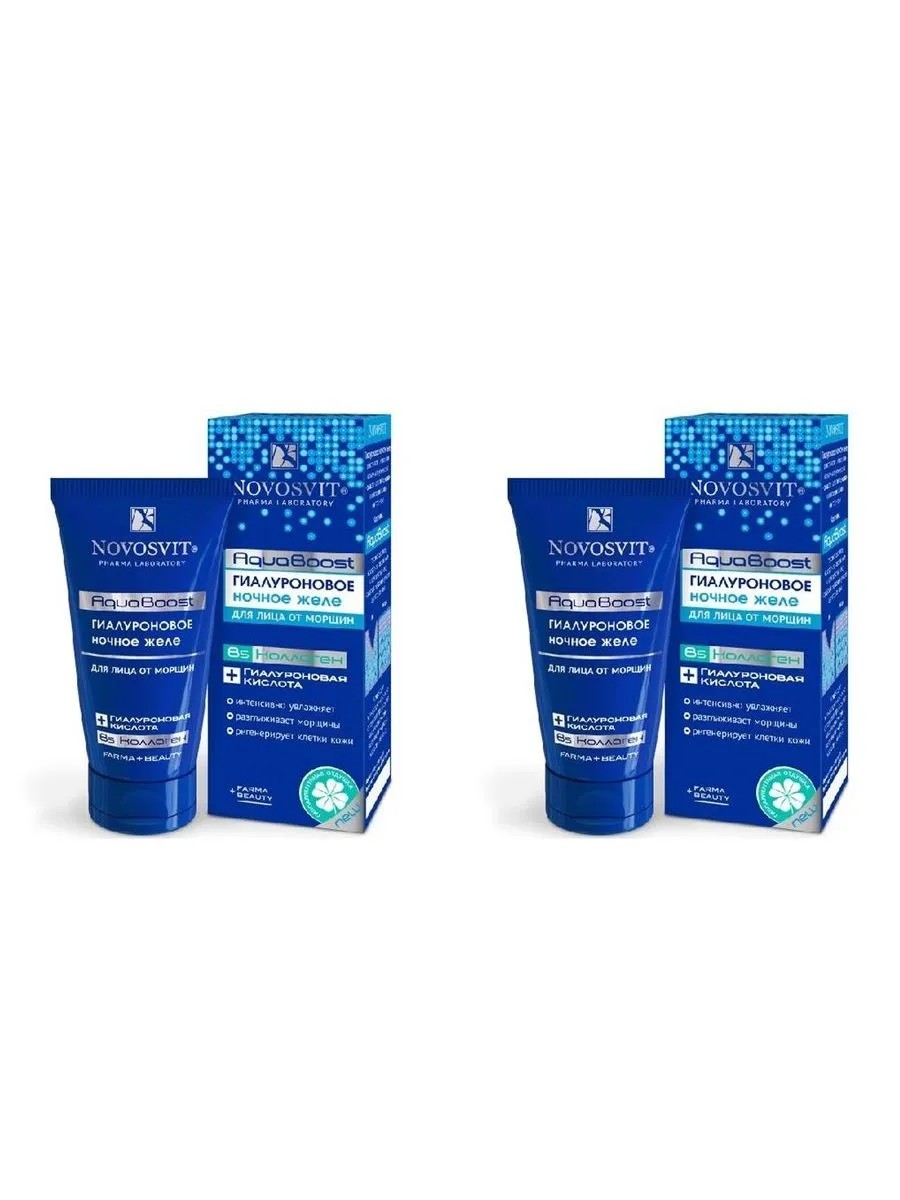 NOVOSVIT AQUABOOST HYALURONIC NIGHT JELLY FOR WRINKLE FACE 50ML. Hyaluronic night jelly provides intense and long-lasting hydration, nourishing the skin with rejuvenating and nourishing ingredients. The AquaBoost complex helps retain and preserve moisture in the skin while you sleep, creating ideal conditions for rest. It activates skin cell regeneration, smoothes wrinkles, and improves complexion. For cosmetic care of the skin around the eyes: Aqua (Water), Glycerin, Sodium Hyaluronate, Soluble Collagen, Sodium Polyacrylate, Dimethicone, Cyclopentasiloxane, Trideceth-6, PEG-18 Dimethicone, Betaine, Zea Mays (Corn) Oil, Avena sativa (Oat) Kernel Oil, Triticum Vulgare (Wheat Germ) Oil, Polymethylsilsesquioxane, Tocopheryl Acetate, Methyl Paraben, Propyl Paraben, BHT, Parfum. Brand NOVOSVIT Highly effective Novosvit cosmetics deeply moisturize and nourish the skin, restoring the epidermis and activating its protective function, and also promotes active rejuvenation. Novosvit hyaluronic night jelly with a unique formula developed specifically for night care, intensively moisturizes and enhances skin cell regeneration during sleep. The gel-jelly texture spreads easily over the skin and absorbs instantly, leaving no sticky feeling. The AquaBoost complex promotes moisture retention and cell regeneration, smoothing wrinkles and improving complexion. Hyaluronic acid provides long-lasting hydration, smoothing skin texture, and renewing the skin. In the morning, skin looks fresh, smooth, and nourished. After just 4 weeks of use, skin appears more elastic and hydrated, acquiring a healthy glow. Active ingredients: hyaluronic acid, collagen, panthenol, vitamin B5, glycerin. Oils and extracts: castor oil, green tea extract. Does not contain sulfates or parabens. Apply in the evening with light fingertips to clean skin of the face and neck.