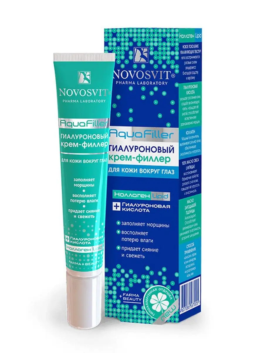 Гиалуроновый крем-филлер «AquaFiller» для кожи вокруг глаз мгновенно заполняет морщины, улучшает состояние кожи и создает увлажняющую «сеть», длительно сохраняя влагу. За его эффективность отвечает комплекс активных компонентов: гиалуроновая кислота, морской коллаген, 100% масло овса и масло зародышей пшеницы.