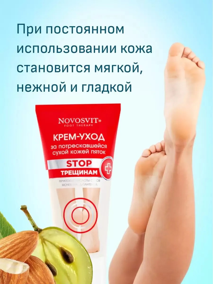 Крем- уход эффективно ухаживает за сухой кожей ступней, рекомендуется при шелушении и растрескивании кожи пяток. Фруктовые кислоты соков киви, апельсина, грейпфрута и яблока, усиленные мочевиной, смягчают, отшелушивают, способствуют обновлению клеток. Масло виноградной косточки, Д- пантенол, витамин Е, экстракт сладкого миндаля смягчают и увлажняют кожу, активизируют регенерацию, восстанавливают потрескавшуюся кожу пяток. При регулярном использовании крем делает кожу пяток нежной и гладкой.