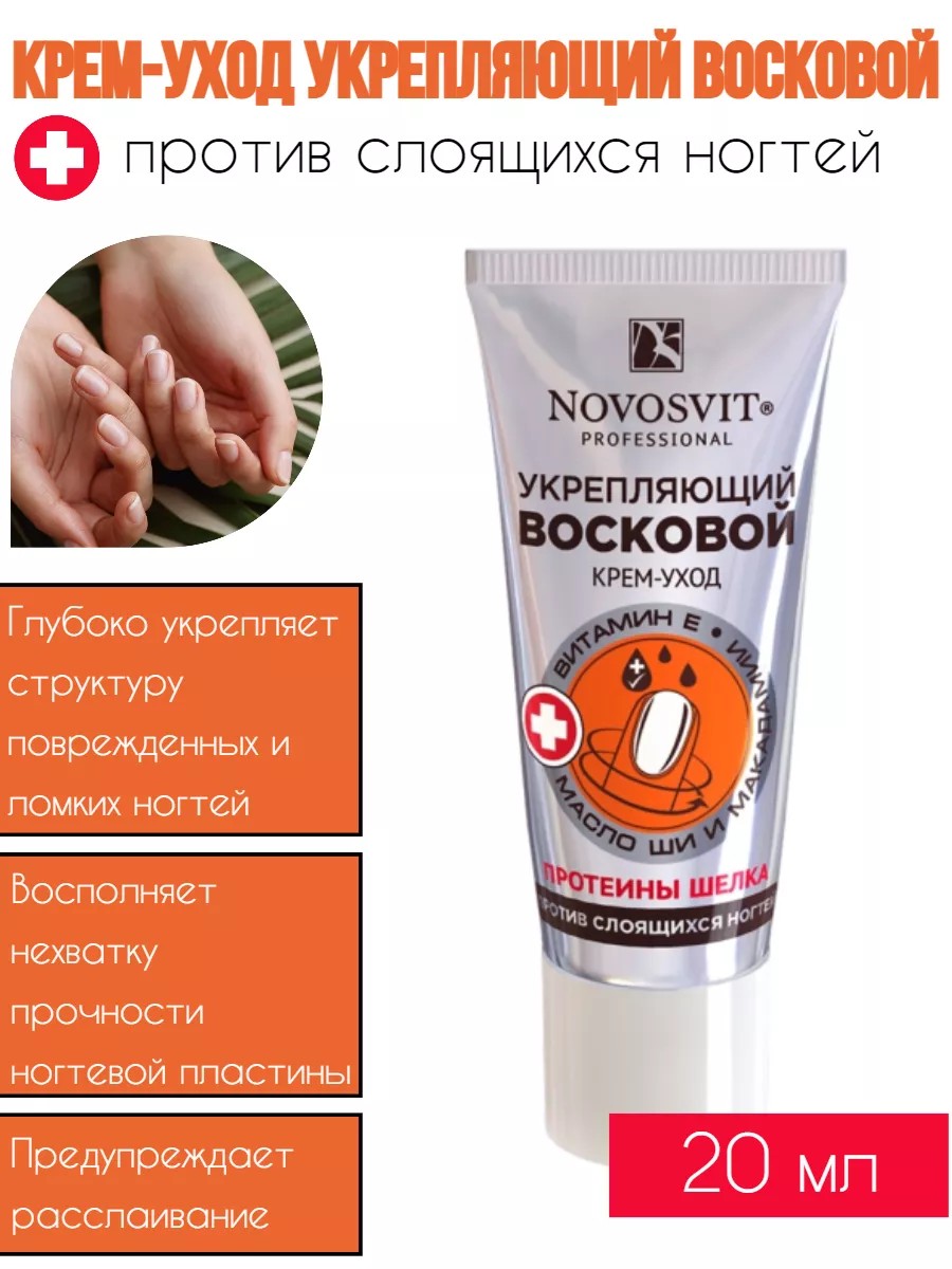 Novosvit nail care cream with beeswax and silk proteins is designed to strengthen flaking nails.