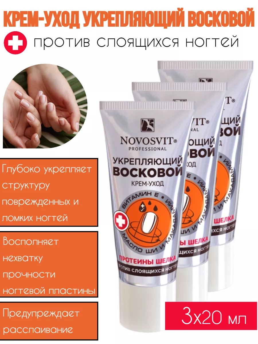 Novosvit nail care cream with beeswax and silk proteins is designed to strengthen flaking nails.