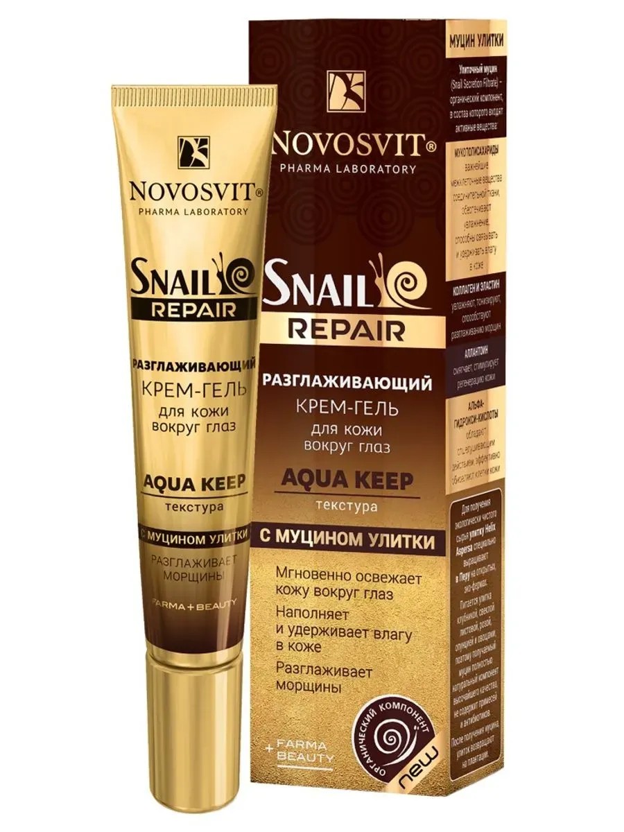 Novosvit snail repair разглаживающий крем-гель для кожи вокруг глаз aqua keep с муцином улитки мгновенно увлажняет и освежает кожу вокруг глаз. Это белоснежная кремовая текстура со свежими нотами цикламена, цветков лотоса и легкой минеральной амброй. Крем нужен, чтоб восстановить упругость и эластичность кожи вокруг глаз и придать свежесть, увлажнение и сияние.