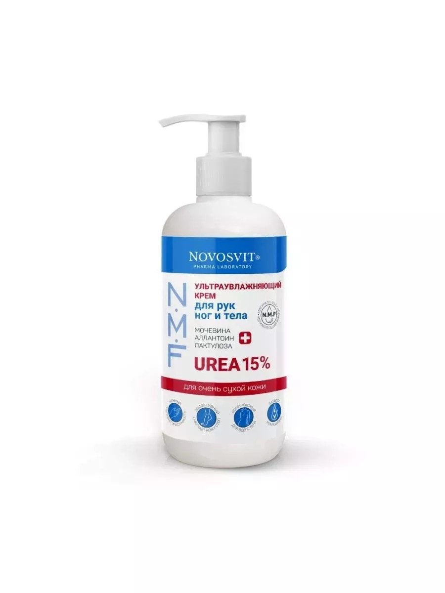 NOVOSVIT КРЕМ ДЛЯ РУК НОГ И ТЕЛА УЛЬТРАУВЛАЖНЯЮЩИЙ 200МЛБренд Novosvit (Новосвит) - инновационная косметика по уходу за кожей лица и тела.NOVOSVIT Ультраувлажняющий крем для рук, ног и тела.Внешний вид: Кремообразная масса с лёгкой, невесомой отдушкой.Ультраувлажняющий крем для рук, ног и тела подходит для всех типов кожи, особенно для сухой, обезвоженной и склонной к шелушению. Устраняет ощущение сухости и стянутости, смягчает кожу.Мочевина -- один из компонентов NMF (натурального увлажняющего фактора). Обеспечивает необходимый уровень увлажнения, удерживая молекулы воды в роговом слое.Мочевина в высокой концентрации 15% за счет активного отшелушивания ороговевших клеток размягчает и выравнивает огрубевшую кожу. Комплекс аллантоина в сочетании с пребиотиком лактулозой успокаивает, поддерживает баланс микробиома кожи.Подходит для сухой кожи.Результат: Увлажненная, напитанная кожаНебольшое количество крема нанести на чистую кожу и массировать до полного впитывания.Избегать попадания в глаза.