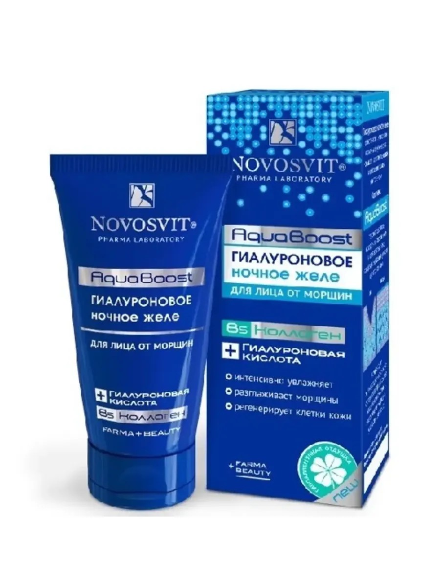Novosvit Hyaluronic Night Jelly, with a unique formula designed specifically for night care, intensely moisturizes and enhances skin cell regeneration during sleep.