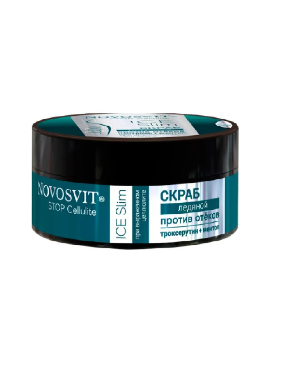Novosvit. Ice Scrub for Severe Cellulite, 180 ml. ICE Slim Ice Scrub for Severe Cellulite, with drainage and lipolytic (fat-burning) properties, is designed specifically for severe forms of cellulite. Active ingredients stimulate metabolism, improve microcirculation and lymphatic drainage, which helps reduce swelling and the lumpy appearance of cellulite. Promotes the removal of excess intercellular fluid. Stimulates lymphatic drainage. Reduces the appearance of cellulite.