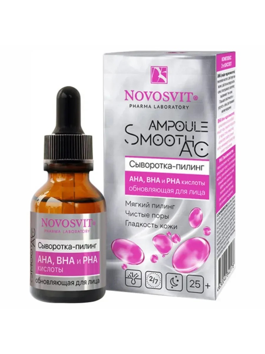 Сыворотка-пилинг NOVOSVIT AMPOULE SMOOTH AC подходит для всех типов кожи и рекомендована к использованию с 25 лет. Благодаря мощному комплексу AHA, BHA и PHA кислот, она эффективна в обновлении кожи, придавая ей гладкость и чистоту.