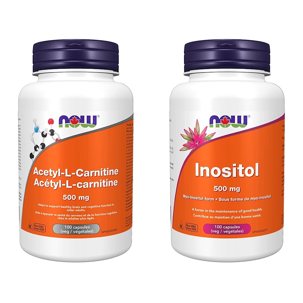 NOW - Acetyl L-Carnitine 500mg 100 vcaps Acetyl-L-Carnitine (ALC) is a modified amino acid that supports cellular energy production by assisting in the transport of fat into the mitochondria where it is converted into ATP (cellular fuel). ALC is a highly bioavailable form of L-Carnitine that can cross the blood-brain barrier, where it helps to manage oxidative damage, supports mitochondrial function and helps to maintain normal neurotransmitter activity. Now Inositol 500mg 100vcap Inositol is an essential component of all cell membranes, where it functions as a cell signaling molecule and aids in the metabolism of fatty acids. It is an important foundational nutrient for a natural mood balance protocol.Take Acetyl L-Carnitine and Inositol supplements together for brain health and cognitive function. Both supplements are packaged in bottles with 100 capsules each (unit count type: count). Acetyl L-Carnitine capsules contain Acetyl-L-Carnitine (From Acetyl-L-Carnitine Hydrochloride) 500 mg per capsule Non-medicinal ingredients include vegetable capsule and stearic acid. NOW Inositol 500mg 100 vegetarian capsules Part of B vitamin family and brain nutrient that maintains good health. NOW Acetyl L-Carnitine 500mg 100 vegetarian vegan capsules help support healthy brain and cognitive function in older adults Highest grade available.