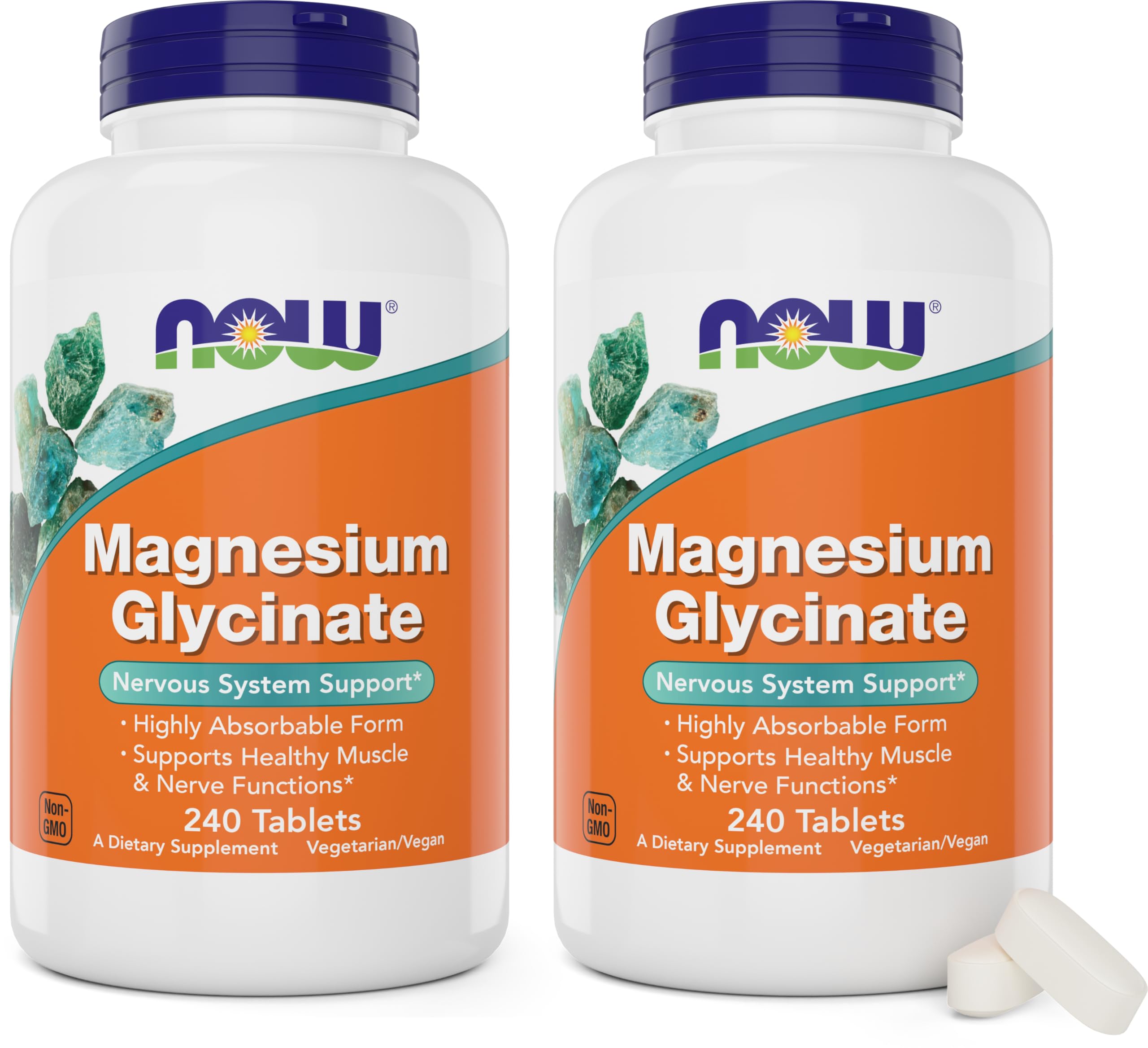 NowFoods Magnesium Glycinate, 240 Count (Pack of 2) - Supports Healthy Muscle and Nerve Functions - Non-GMO Supplement for Women and Men PREMIUM VERSION OF Magnesium glycinate which utilizes magnesium bound to the amino acid glycine, which facilitates intestinal absorption. Magnesium is a mineral that is critical for energy production, muscle contraction, and nerve impulse transmission. Among the processes that require magnesium are protein production. Superior Manufacturing ? GMP Quality Assured SUGGESTED USAGE: Take 2 tablets 1 to 2 times daily with food. NOW FOODS - TRUSTED FOR OVER 50 YEARS ✓ Founded in 1968 to provide top-quality, affordable vitamins and health foods ✓ Family Owned ✓ Based in the heartland of the Midwest ✓ Manufactured in the USA ✓ Tested for purity by Now's team of 150 quality-control professionals. Over 10,000 lab tests performed each month. Add to your cart today because you deserve the best life. MAKE THE SMART CHOICE ✓ Vegan Vegetarian ✓ Non-GMO ✓ Not manufactured with wheat, gluten, soy, milk, egg, fish, shellfish, tree nut or sesame ingredients. Produced in a GMP facility that processes other ingredients containing these allergens.GOING GREEN: We are planting 1 tree for every 20 bottles sold of this 240-count size product, up to 5,000 trees per year. Help us make the world a greener place. HEALTHY CHOICE: Not manufactured with wheat, gluten, soy, milk, egg, fish, shellfish, tree nut or sesame ingredients. Produced in a GMP facility that processes other ingredients containing these allergens. MANUFACTURED IN USA: NOW Foods is a family owned company and has been operating since 1968. PREMIUM VERSION of Magnesium glycinate which utilizes magnesium bound to the amino acid glycine, which facilitates intestinal absorption. . NOW FOODS Magnesium Glycinate, 240 Tablets (Pack of 2).