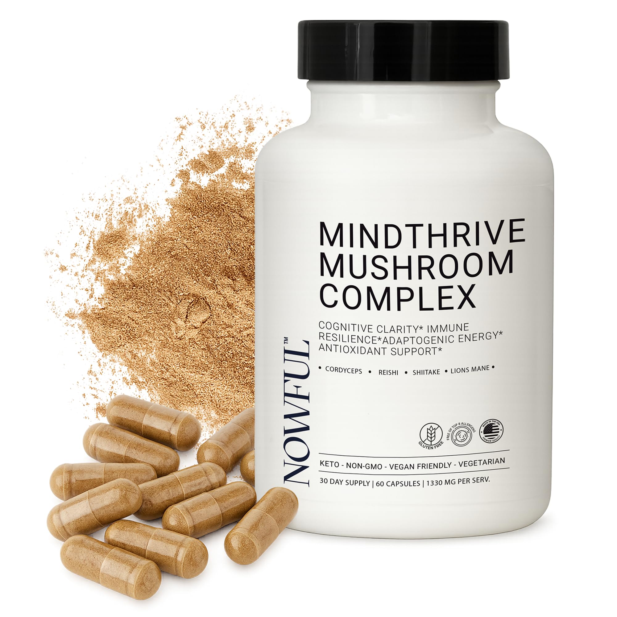 Nowful MindThrive Mushroom Complex Lion's Mane Turkey Tail Cordyceps Reishi & Shiitake Everyday Dose for Sharp Focus Natural Energy Calm Strength & Immune Health (60 Capsules)
