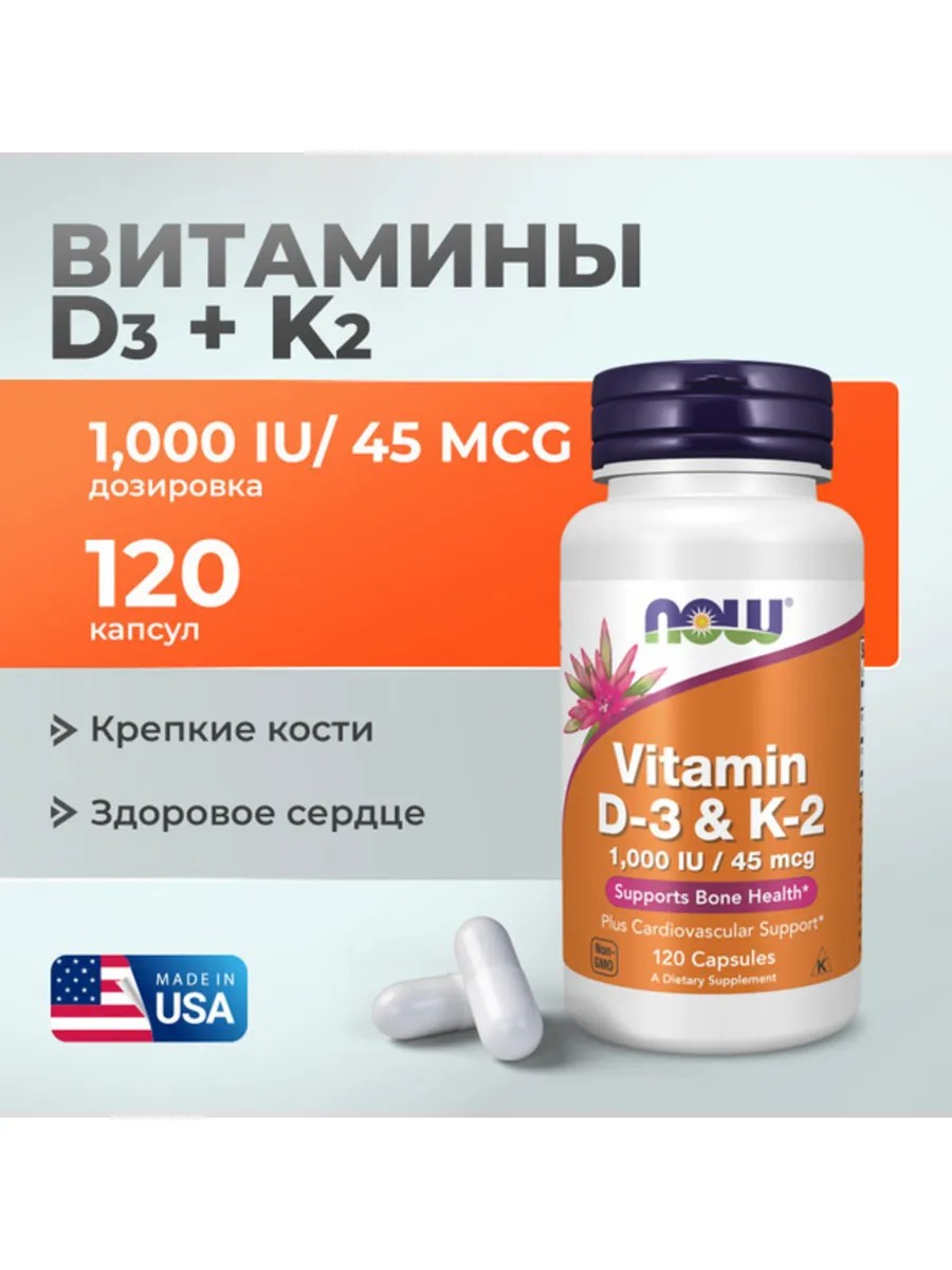 Содержит 1000 МЕ витамина D3 и витамин K2 в каждой капсуле