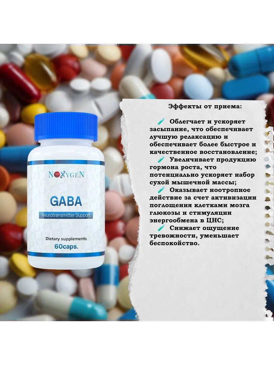 GABA от Noxygen (гамма-аминомасляная кислота) – аминокислота, выполняющая роль нейромедиатора в центральной нервной системе.
