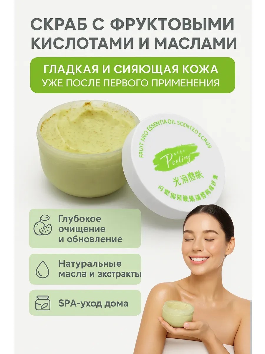 Thanks to a combination of fruit acids (lactic and glycolic), natural oils, and abrasive particles, the scrub gently removes dead skin cells, improves texture, and restores softness and radiance to the skin.