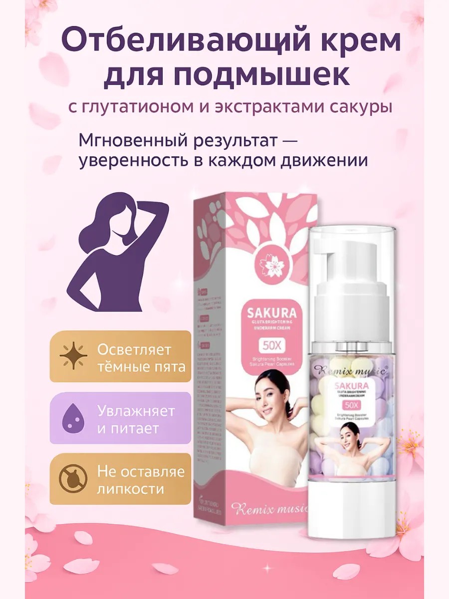 Формула с глутатионом и экстрактами сакуры активно борется с пигментацией, ускоряет обновление клеток, увлажняет и питает кожу. Регулярное применение крема позволяет добиться заметного результата: подмышки становятся светлее, кожа — мягкой, гладкой и ухоженной.