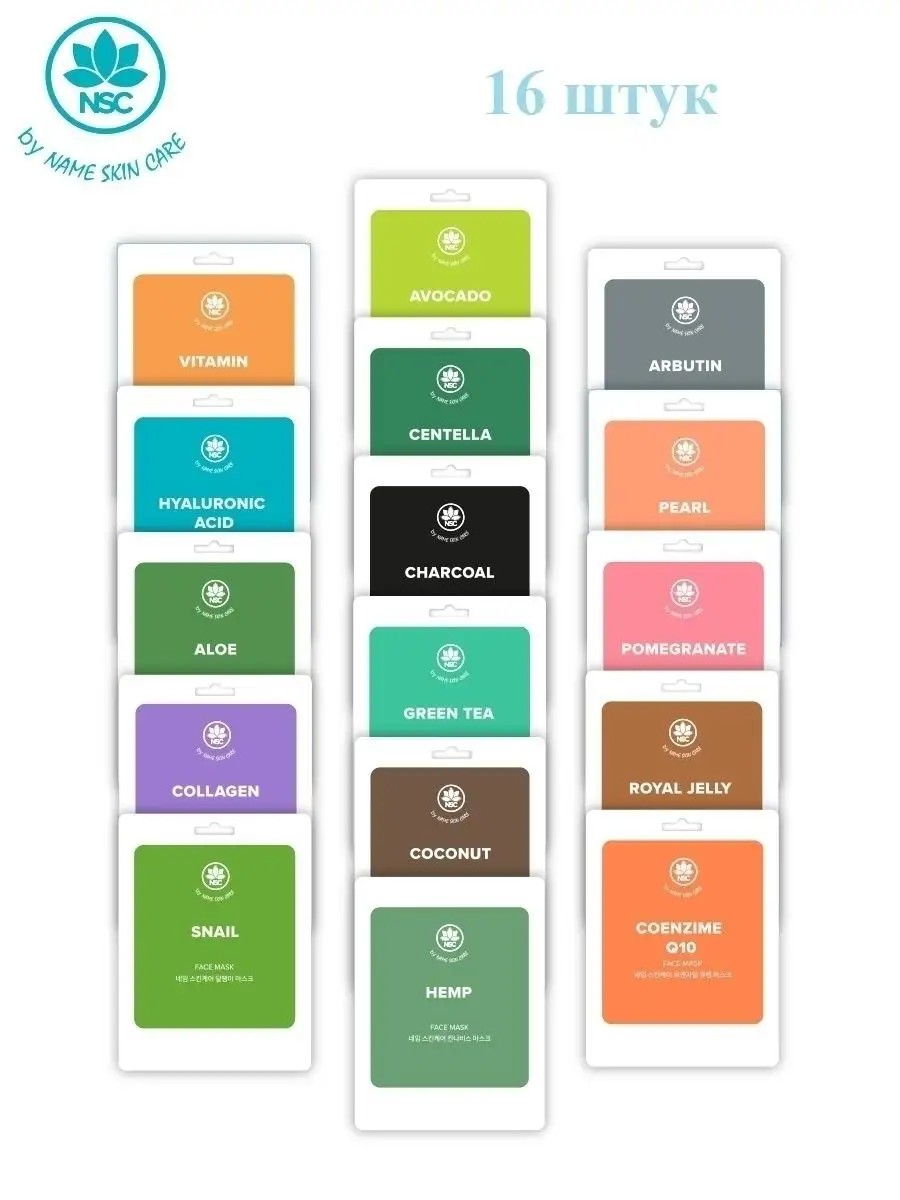 NAME SKIN CARE sheet masks actively moisturize and restore skin; they restore an even, radiant tone, soothe, and improve elasticity. The set includes 16 assorted masks: collagen, hyaluronic acid, snail mucin, aloe, vitamin, royal jelly, pearl, pomegranate, Q10, arbutin, avocado, charcoal, centella, green tea, hemp oil, and coconut.