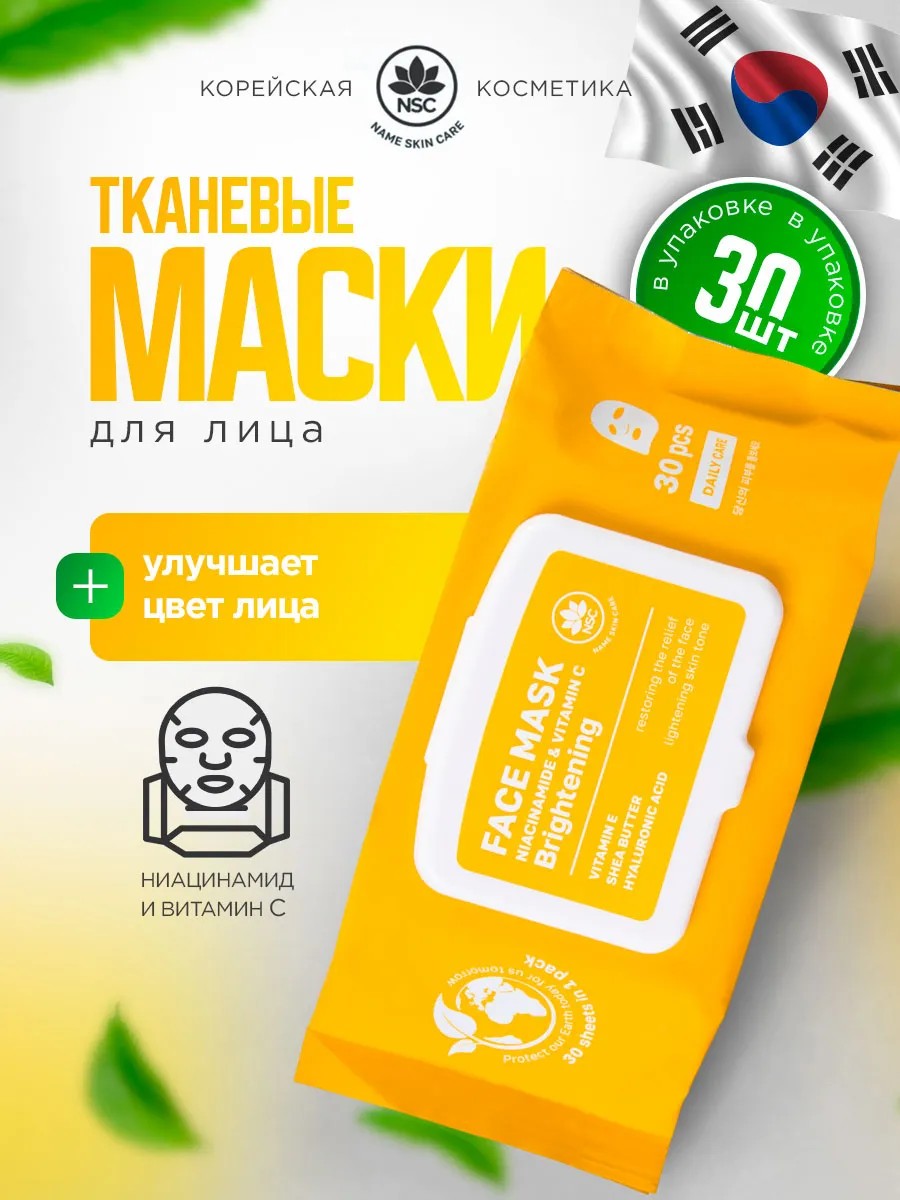 NSC Тканевые маски для лица с Ниацинамидом и Витамином C, 1 упаковка пакет = 30шт масок.