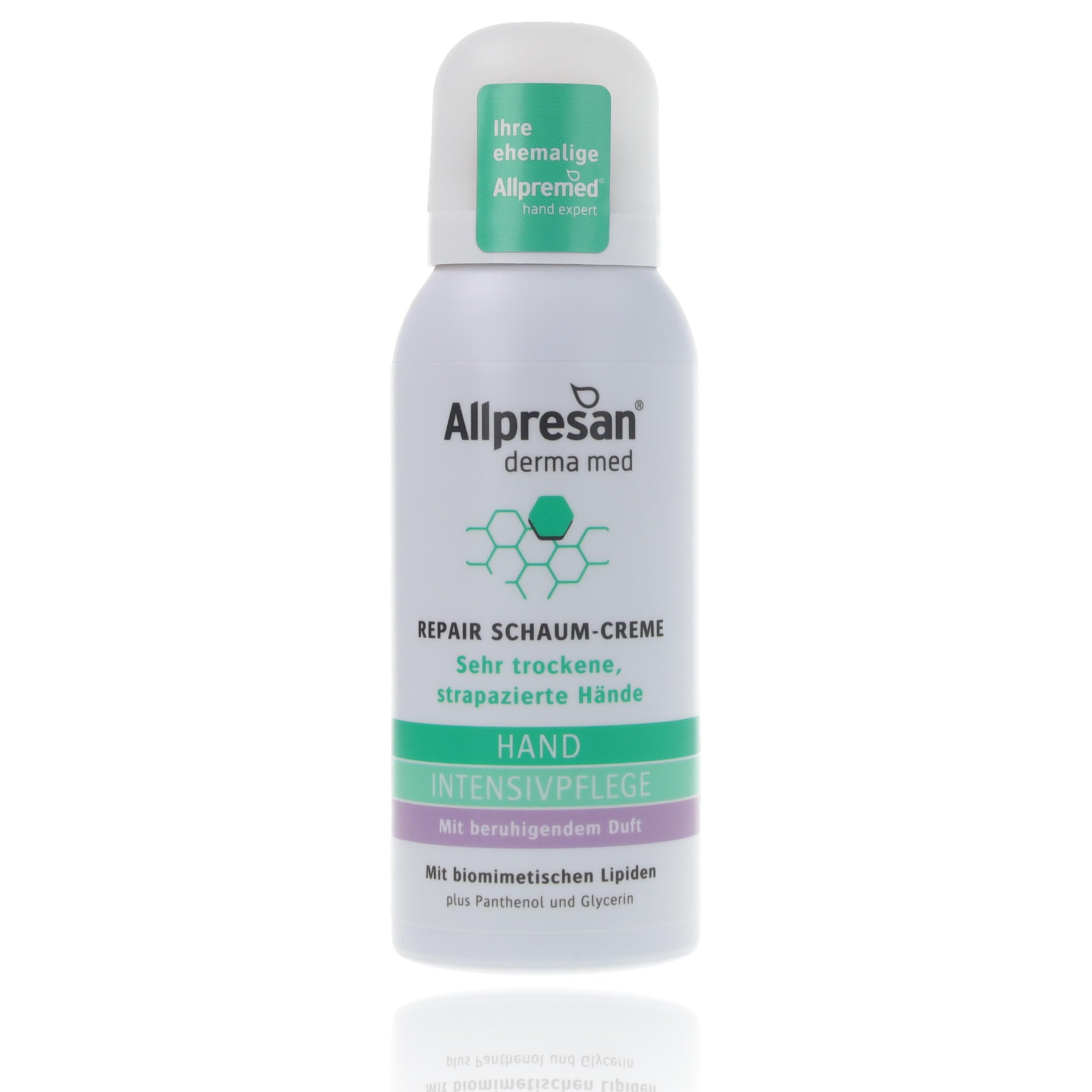 Our medical intensive hand care has been specially developed to intensively supply lipids and moisture to very dry and stressed skin on the hands. This highly effective formula contains biomimetic (skin-related) lipids, panthenol and glycerin, which together provide comprehensive care. Our care has been proven to restore the skin barrier and promote the natural regeneration of your skin. This leads to noticeably more flexibility and well-being for your hands. We are proud to offer a vegan formula that is free from fragrances, dyes and preservatives. Our packaging is made from 100 recycled aluminum and underlines our commitment to sustainability. Discover the care your hands deserve and experience intensive hydration and regeneration with our medical hand intensive care. INGREDIENTS aqua, ocyldodecanol, decyl oleate, butane, glycerin, panthenol, cetyl alcohol, propane, stearic acid, glyceryl stearate, caprylic capric triglycerides, hydrogenated lecithin, sorbitol, capryl glycol, palm glyceride, sodium lauroyl sarcosinate, butyrospermum. Parkii butter, Pentylene glycol, Capryloyl Glycine, Potassium Lauroyl Wheat Amino Acids, Parfum, Squalane, Allantoin, Citric Acid, Ceramide NP, Tocopherol, Hydrogenated Palm Glycerides Citrate, Limonene, Hexyl Cinnamal, Alpha-isomethyl ionone, Citronellol, Hydroxycitronellol, Linalal. ool, geraniol, gasoline. yl alcohol, benzyl salicylate.It restores the defective skin barrier of damaged hands and supports the reduction of redness and irritation of the skin. The foam cream intensively supplies the skin of the hands with biomimetic (skin-related) lipids and moisture. Foam cream contains panthenol and glycerin. Medical hand care for intensive care and regeneration of very dry and damaged skin. Repairs the skin barrier and supports the reduction of redness and irritation of the skin. The openings in the lipid film are demonstrably closed. With soothing scent.Allpresan Derma Med Repair Schuimcrème met rustgevende geur - voor de verzorging van zeer droge en beschadigde handen - 100 ml Onze medische intensieve handverzorging is speciaal ontwikkeld om zeer droge en belaste huid op de handen intensief van lipiden en vocht te voorzien. Deze zeer effectieve formule bevat biomimetische (huidverwante) lipiden, panthenol en glycerine, die samen voor een uitgebreide verzorging zorgen. Onze verzorging herstelt aantoonbaar de huidbarrière en bevordert de natuurlijke regeneratie van je huid. Dit leidt tot merkbaar meer soepelheid en welzijn voor je handen. Wij zijn er trots op een veganistische formule aan te bieden die vrij is van geurstoffen, kleurstoffen en conserveringsmiddelen. Onze verpakking bestaat uit 100 gerecycled aluminium en onderstreept onze toewijding aan duurzaamheid. Ontdek de verzorging die je handen verdienen en ervaar intensieve hydratatie en regeneratie met onze medische hand-intensieve verzorging. INGREDIËNTEN aqua, ocyldodecanol, decyloleaat, butaan, glycerine, panthenol, cetyl alcohol, propaan, stearicum, glycerylstearaat, caprylic capric triglyceriden, gehydrogeneerde lecithine, sorbitol, caprylglycol, palmglyceride, natriumlauroyl sarcosinaat, butyrospermum. Parkii boter, Pentyleenglycol, Capryloyl Glycine, Potassium Lauroyl Wheat Amino Acids, Parfum, Squalane, Allantoïne, Citric Acid, Ceramide NP, Tocoferol, Hydrogenated Palm Glycerides Citraat, Limoneen, Hexyl Cinnamal, Alpha-isomethyl ionone, Citronellol, Hydroxycitronellol, Linalal. ool, geraniol, benzine. yl alcohol, benzylsalicylaat.Het herstelt de defecte huidbarrière van beschadigde handen en ondersteunt het afnemen van roodheid en irritatie van de huid. De schuimcrème voorziet de huid van de handen intensief met biomimetische (huidverwante) lipiden en vocht. Schuimcrème bevat panthenol en glycerine. Medische handverzorging voor intensieve verzorging en regeneratie van zeer droge en beschadigde huid. Repareert de huidbarrière en ondersteunt het afnemen van roodheid en irritatie van de huid. De openingen in de lipidefilm worden aantoonbaar gesloten. Met rustgevende geur.