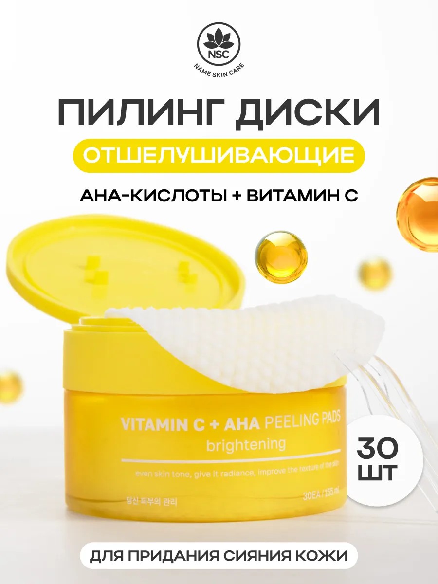Отшелушивающие пилинг пэды ( диски ) с витамином C и AHA-кислотами NAME SKIN CARE заметно улучшают текстуру кожу и выравнивают ее тон, способствуют увлажнению, помогают ей стать более сияющей. При регулярном применении помогают устранить неровности, расширенные поры и мелкие морщинки.Витамин C придает коже упругость и сияние, мгновенно заряжает энергией. Кислоты, входящие в состав, усиливают действиевитаминаС, помогая ему проникать в глубокие слои кожи. Молочная, гликолевая, яблочная, винная кислоты уменьшают выраженность пигментных пятен, поддерживают естественное обновление кожи и борются с видимыми признаками старения. Экстракт миротамнуса увлажняет, укрепляет ослабленный кожный барьер, успокаивает чувствительную кожу.