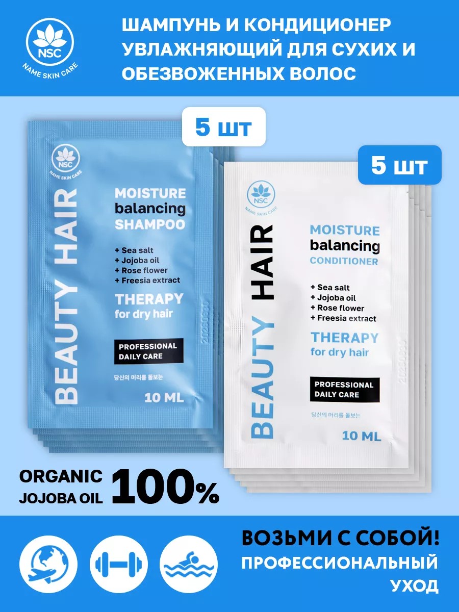 Набор шампунь и кондиционер увлажняющий для сухих и обезвоженных волос BEAUTY HAIR, NSC, 5+5 х 10 мл. Произведен в Южной Корее. Корейская косметика для волос давно зарекомендовала себя как качественный, полноценный, профессиональный уход салонного уровня на дому.