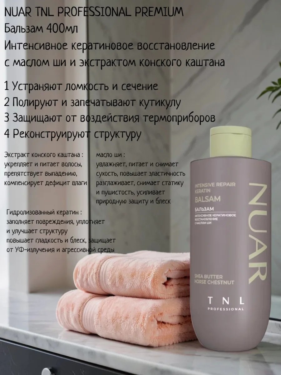 | Full product name | Hair balm NUAR intensive keratin restoration with shea butter and horse chestnut extract, TNL Professional, 400 ml |