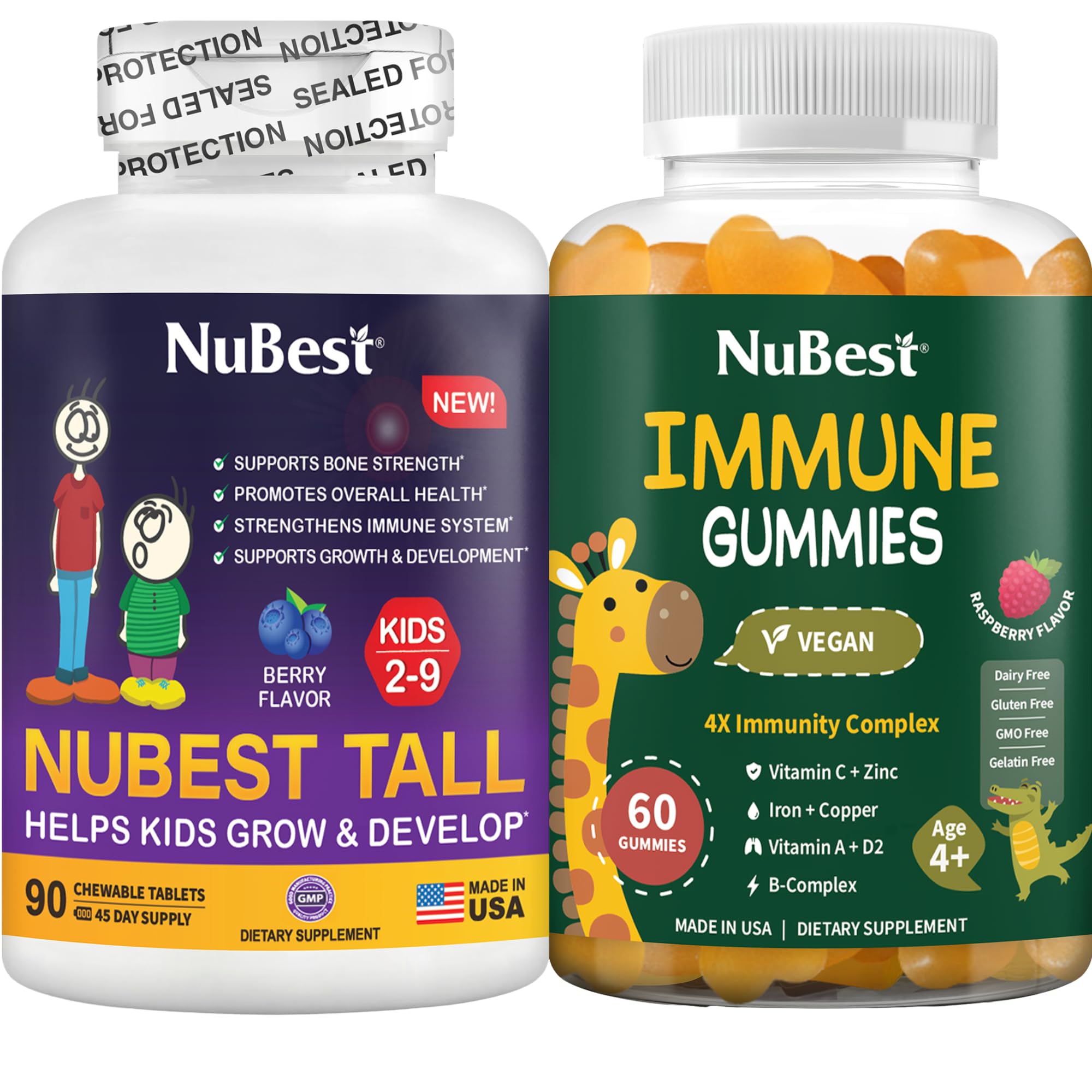 Fits Everyday Family Routines: Simple to incorporate into morning or after-meal routines for growing kids at home or school. Kid-Friendly Formats Flavors: Easy-to-chew tablets with fun shapes plus delicious raspberry-flavored gummies, ideal for picky eaters. Daily Immune Nutrition: Immune Gummies include Vitamins C, D, A, B-complex, Zinc, and Iron to support immune health during everyday activities. Designed for Young Children: NuBest Tall Kids tablets are formulated for toddlers and kids ages 2-9 Immune Gummies are suitable for ages 4 . Bone Immune Wellness: Combines NuBest Tall Kids Chewable Tablets with NuBest Immune Gummies to support bone health and immune wellness as part of a daily routine.