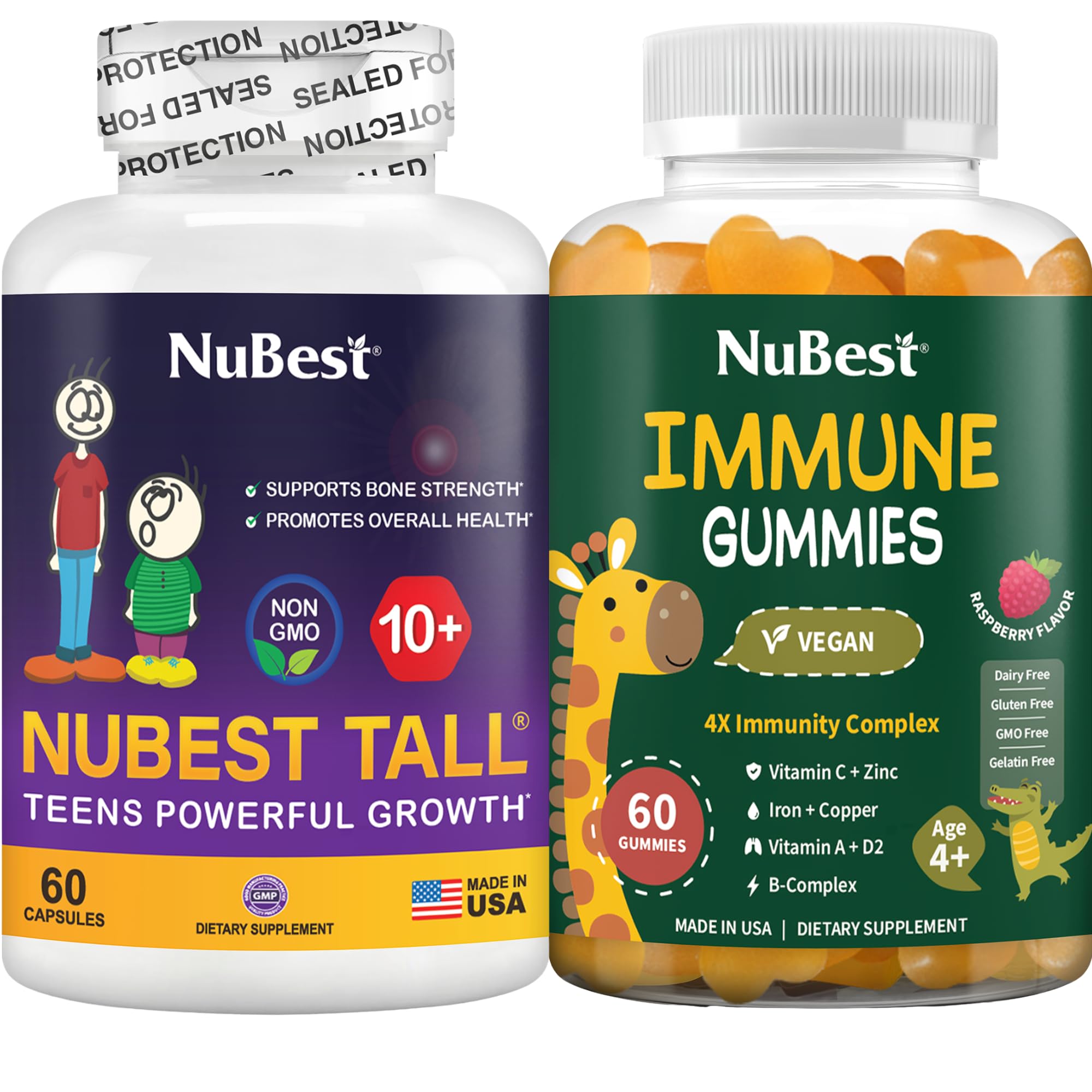 Easy to Use, Family-Friendly Formats: Capsules for older kids and teens plus delicious raspberry-flavored gummies for simple daily use. Easy to Use, Family-Friendly Formats: Capsules for older kids and teens plus delicious raspberry-flavored gummies for simple daily use. Daily Immune Nutrition: Immune Gummies include Vitamins C, D, A, B-complex, Zinc, and Iron to support immune health during everyday life. Designed for Growing Kids Teens: NuBest Tall 10 is formulated for ages 10 , while Immune Gummies are suitable for kids ages 4 and teeens. Bone Immune Wellness: Combines NuBest Tall 10 Capsules with NuBest Immune Gummies to support bone health and immune wellness as part of a daily routine.