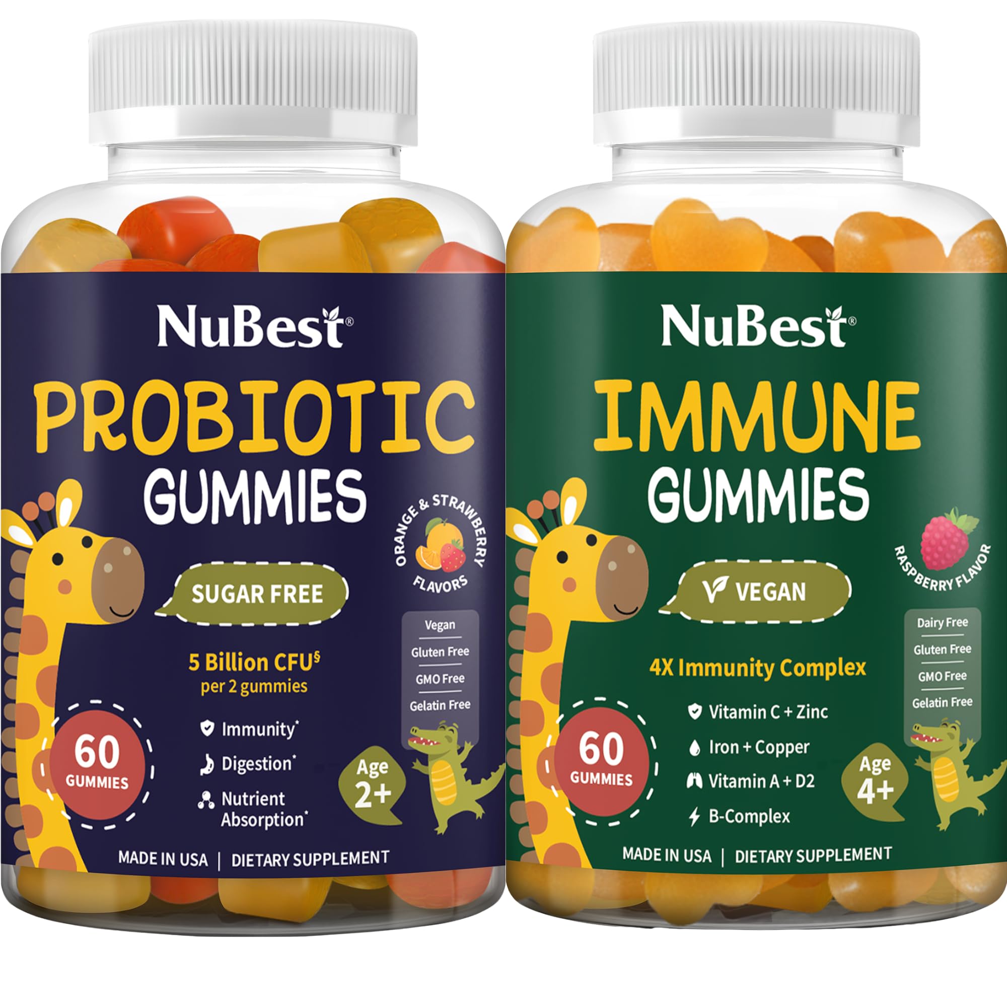 Designed for Growing Kids: Suitable for kids ages 4 (Immune Gummies) and kids teens (Probiotic Gummies) ideal for daily family wellness routines. No Added Sugar and Kid-Friendly Flavors: Made with strawberry, orange, and raspberry flavors in easy-to-chew gummies, vegan-friendly and loved by picky eaters. Immune Nutrition for Everyday Life: Includes vitamins C, D, A, B-complex, Zinc, and Iron to support immune health during school, activities, and seasonal changes. Daily Probiotic Support: Formulated with 5 billion CFUs per serving to help support gut health and digestive comfort in children and teens. Gut Immune Wellness: NuBest Probiotic Gummies and NuBest Immune Gummies to support digestive balance and immune wellness as part of a daily routine.