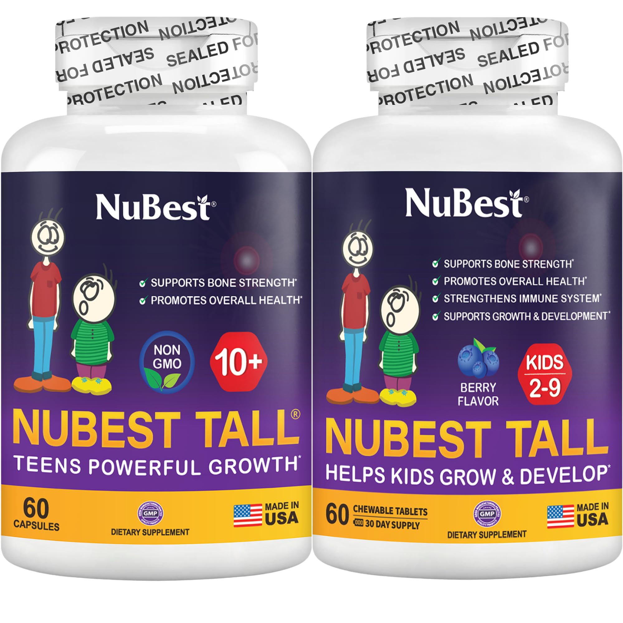 Trusted worldwide by parents to support their child's healthy development. Made with non-GMO ingredients in GMP-certified facilities. Complete growth nutrition tailored for both kids and teens. NuBest Tall 10 60 Capsules: Formulated for children and teens ages 10 , this advanced supplement combines Calcium, Vitamin D3, Vitamin K2, Collagen, and natural herbs to promote bone strength, focus, and overall growth. NuBest Tall Kids 60 Chewable Tablets: Specially designed for children ages 2-9, these tasty chewables deliver Calcium, Vitamin D3, Vitamin K2, and essential nutrients to support bone development, immune health, and natural growth.