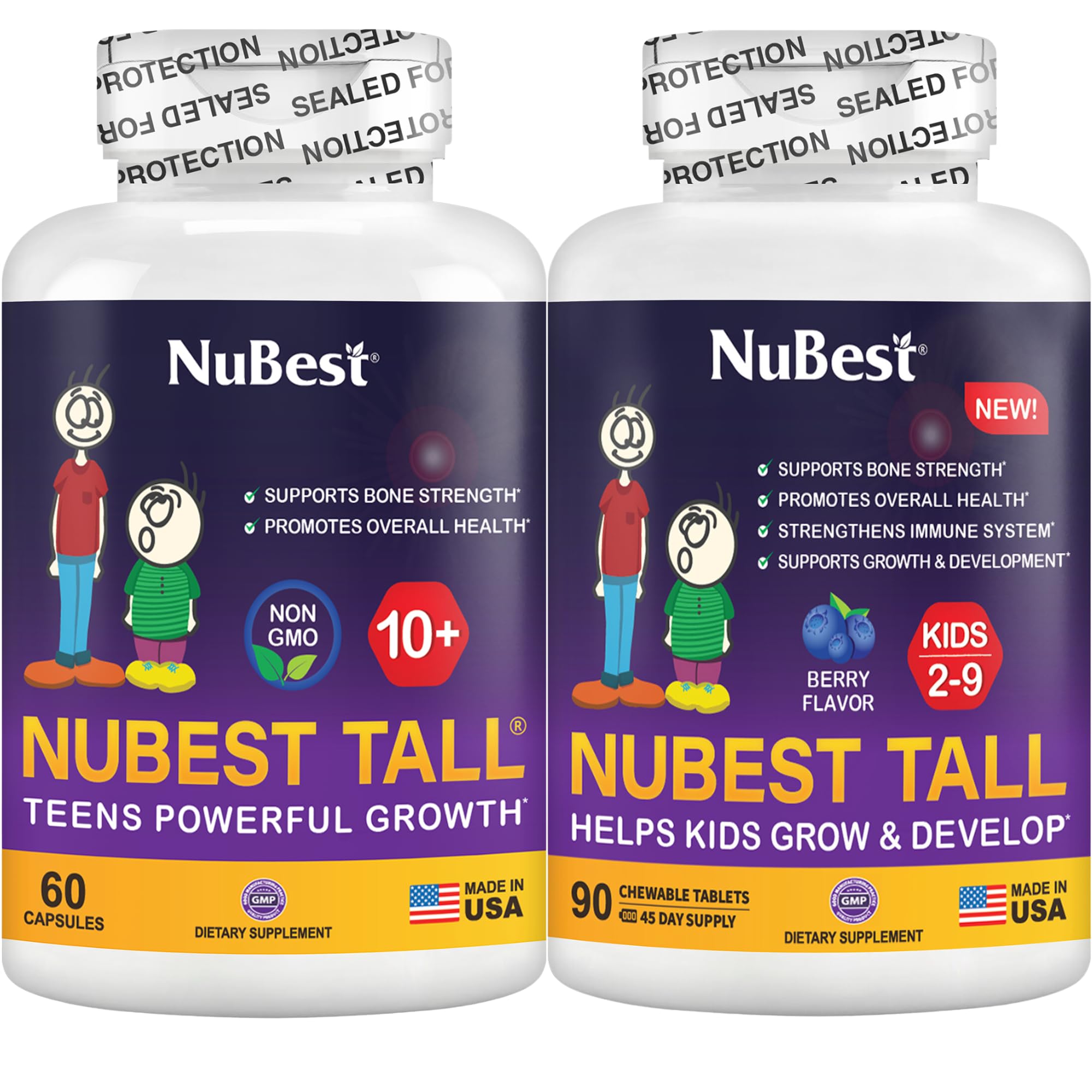 Trusted by parents worldwide for supporting healthy growth. Made in GMP-certified facilities with non-GMO ingredients. With this bundle, parents can ensure their kids receive age-appropriate nutrition to promote bone health, immune function, and overall well-being throughout their growing years. NuBest Tall 10 60 Capsules: Advanced formula tailored for children and teens age 10 , featuring Calcium, Vitamin D3, Vitamin K2, Collagen, and herbal extracts to support bone strength, growth, focus, and overall development. NuBest Tall Kids 90 Chewable Tablets: Delicious chewable tablets formulated for children ages 2-9, providing Calcium, Vitamin D3, Vitamin K2, and a blend of essential nutrients to support strong bones, healthy growth, and overall wellness.