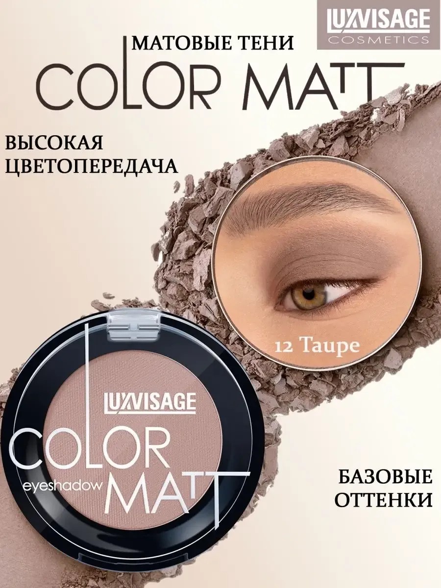 Белорусская косметика для макияжа лица женская luxvisage представляет новинку – матовые тени для век COLOR MATT. Тени для глаз цветные – это прекрасный выбор для и тех, кто любит натуральный макияж и для тех, кто любит яркие акценты в макияже. Палетка от luxvisage тени для век предлагает на выбор 5 базовых оттенков - тени для век матовые нюд, а также яркие оттенки. Макияж с белорусскими тенями для век подчеркнет естественную красоту. Насыщенная цветопередача палетки теней COLOR MATT обеспечит яркие оттенки, которые легко растушевываются и позволяют создать гармоничный образ. Палетка теней для век идеально подходит для дневного макияжа и вечернего образа так как тени для век матовые от Luxvisage идеально наслаиваются и позволяют варьировать интенсивность цвета с помощью дополнительного слоя. Матовые тени для век содержат увлажняющие компоненты, благодаря которым эта косметика подойдет для девочек подростков и для возрастной кожи. Тени для век 12 Taupe серые с коричневым отличный инструмент для создания повседневного макияжа глаз. Цветные тени от белорусского производителя благодаря своей современной формуле обеспечат длительную стойкость макияжа. База под тени может использоваться по Вашему усмотрению, так как продукт не осыпается и не скатывается в течение дня как при самостоятельном использовании, так и при нанесении на основу под тени. Базовые оттенки в данной линейке позволяют создать самостоятельно свой собственный набор теней для век, который подойдет Вашему типажу. Данный продукт ложится ровным и гладким слоем, что позволяет создавать красивые переходы. Отлично подходят для выполнения макияжа в технике смоки айз. Белорусская косметика для женщин – это отличное качество по доступной цене. С помощью новинки от люкс визаж вы сможете создать нежный матовый макияж и дерзкий чувственный вечерний образ, который будет держаться без корректировок в течение дня.