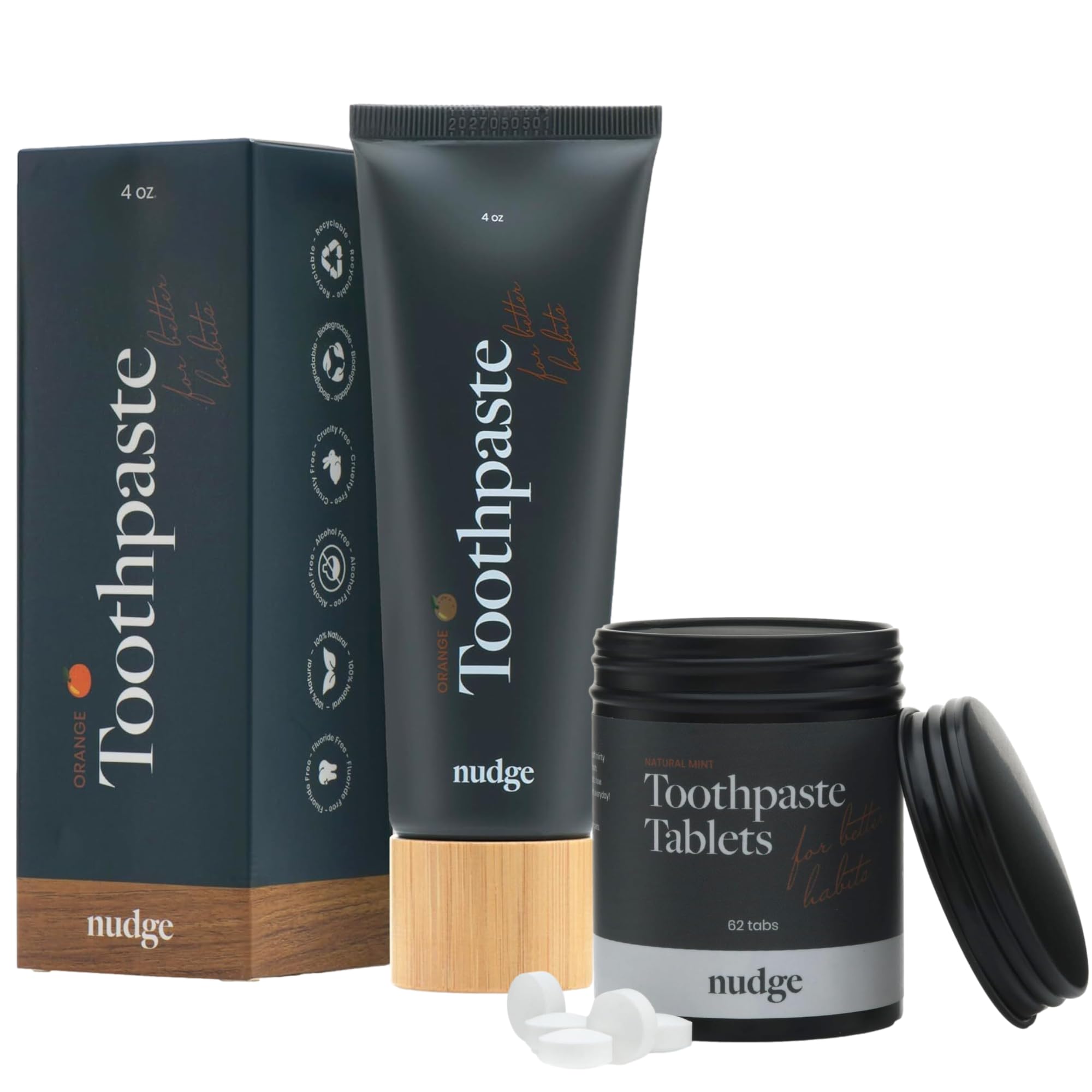 ECO FRIENDLY AND TRAVEL READY: Reduce waste with waterless toothpaste tablets and recyclable packaging. A convenient bundle to support your oral care routine at home and on the go. REFRESHING ORANGE FLAVOR: Enjoy a bright, citrus toothpaste flavor that makes brushing more enjoyable without compromising on performance or clean ingredients. MESS FREE TOOTHPASTE TABLETS: TSA approved and perfect for travel or busy lifestyles. Simply chew, brush, and rinse for a fresh, convenient clean anytime, anywhere. FLUORIDE FREE AND SLS FREE FORMULA: Made without fluoride, sodium lauryl sulfate, artificial dyes, or harsh preservatives. A clean formula designed for everyday use and wellness conscious routines. CLEAN AND EFFECTIVE ORAL CARE: This bundle combines Nudge Toothpaste Tablets and Orange Toothpaste, both powered by our Remin Formula with 10 percent nano hydroxyapatite for enamel support and gentle care of sensitive teeth.