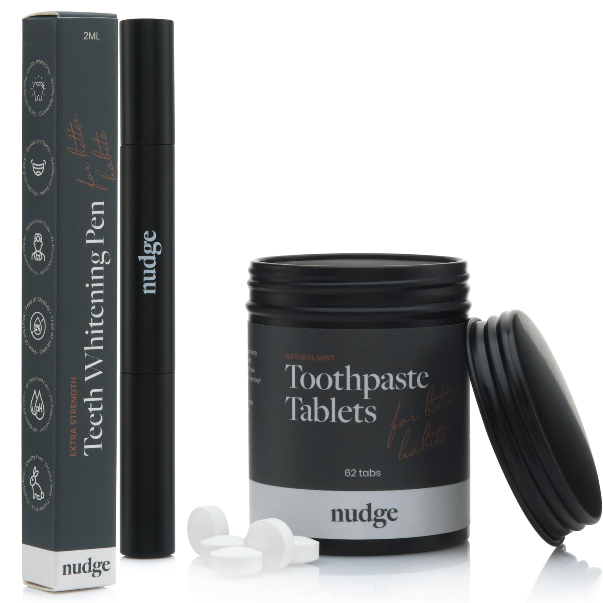 Nudge Toothpaste Tablets and Teeth Whitening Gel Pen Bundle Nano Hydroxyapatite Fluoride Free Sensitivity Friendly 62 Tabs and 2 ml Pen