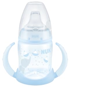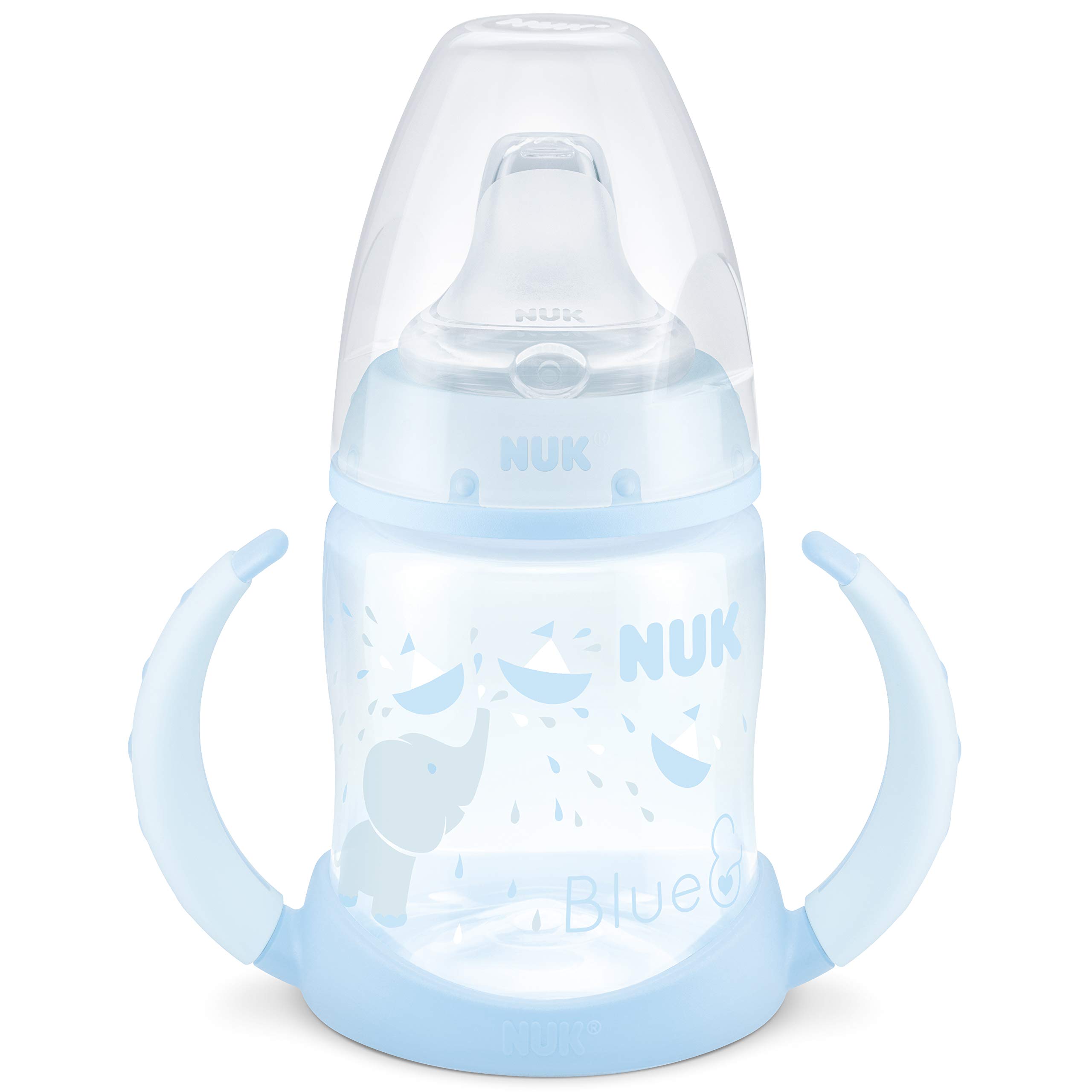 NUK Baby Blue Kollektion, Farbe: hellblau. Trinklernflasche aus Polypropylen (PP), Inhalt 150 ml, BPA frei. Ergonomische Griffe für sicheren Halt. Auslaufsichere Soft-Trinktülle aus Silikon für Kinder von 6-18 Monaten. Leichter Übergang zum selbstständigen Trinken.