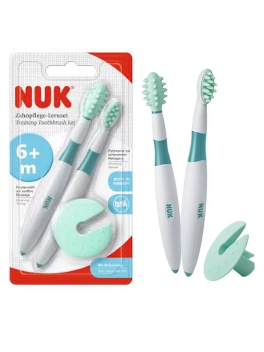 Научить ребенка уходу за зубами желательно до того, как прорежется первый зуб. Набор зубных щеток NUK Learning шаг за шагом знакомит ребенка с чисткой зубов уже с 6и месяцев. Зубная щетка с круглым наконечником мягко массирует труднодоступные участки десен и неба, уменьшая тем самым дискомфорт при прорезывании зубов во рту. Мягкие, устойчивые к прикусу щетинки зубной щетки бережно очищают первые видимые зубы. Тренажеры для ухода за полостью рта. Nuk -это комплект тренажеров с мягкими прочными шишечками, с массажным эффектом для десен. Массажер-тренажер для десен. Зубная щетка-тренажер: для мягкого ухода за первыми зубками малыша Нескользкие ручки эргономичной формы - удобно держать у руке Защитное кольцо препятствует слишком глубокому проникновению в ротовую полость ребенка, может использоваться как подставка для хранения тренажера Для детей с 6 месяцев В упаковке комплект из 3-х предметов.