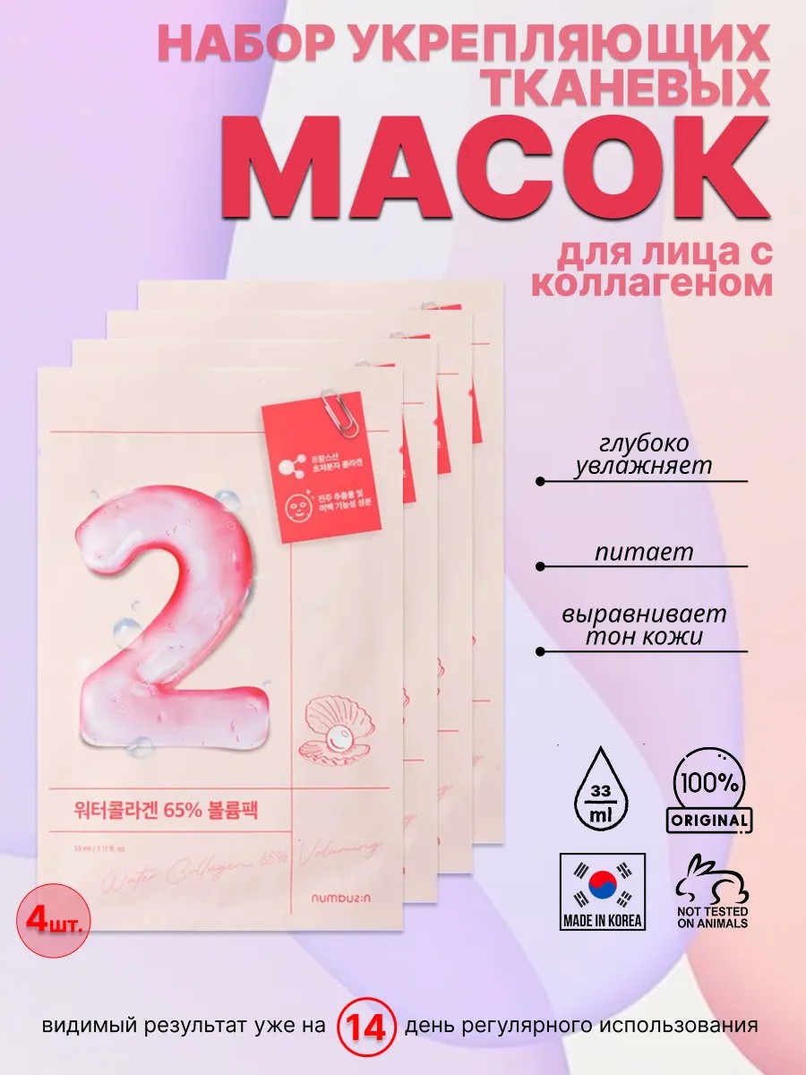 Набор из 4 масок! Обеспечьте вашей коже надлежащий уход с помощью укрепляющей маски для лица Numbuzin No.2.Water Collagen 65% Voluming Sheet Mask. Эта тканевая маска, разработанная специально для обезвоженной кожи, поможет вернуть упругость и свежесть. Содержит уникальную формулу , которая проникает в глубокие слои дермы благодаря маленькому размеру молекул. Высококонцентрированная эссенция, обогащенная гиалуроновой кислотой и морским коллагеном, целенаправленно борется с признаками увядания, устраняя морщинки и кожные заломы. Маска выровняет тон, придаст коже здоровое сияние, смягчит и увлажнит ее.