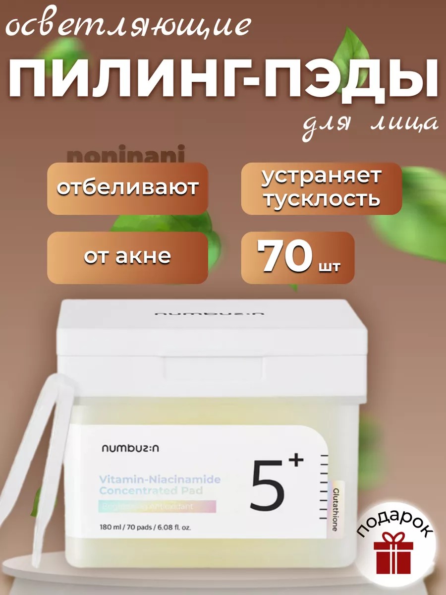 Осветляющие витаминные пэды numbuzin No.5 Vitamin-Niacinamide Concentrated Pad отбеливает гиперпигментацию, уменьшает следы от акне, веснушки и мелазму, выравнивает тон и устраняет тусклость.