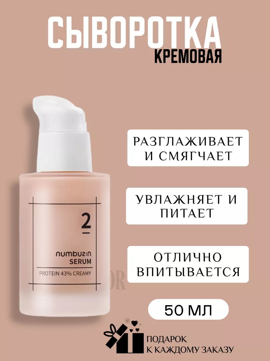 Кремовая сыворотка numbuzin No.2 Protein 43% Creamy Serum разглаживает и смягчает, восстанавливает повреждённый защитный барьер, выравнивает текстуру кожи, устраняет сухость и успокаивает.