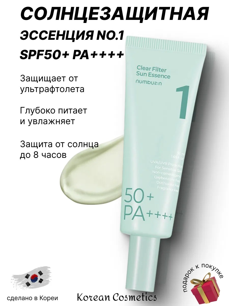 Лёгкая успокаивающая солнцезащитная эссенция Numbuz:n No.1 Clear Filter Sun Essence SPF50+ PA++++ 50мл обеспечивает защиту от ультрафиолетового UVA- и UVB-излучения, предотвращая появление солнечных ожогов, пигментных пятен и признаков фотостарения.