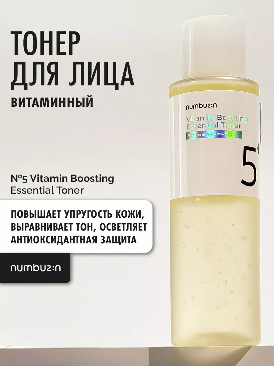 Антивозрастной тонер для сияния кожи Numbuzin No.5 Vitamin Boosting Essence Toner обогащенный витаминами, мгновенно увлажняет кожу и эффективно выравнивает её тон, а также сужает расширенные поры. Восстанавливает блеск и здоровое сияние уставшей кожи с помощью этого продукта. Тонер обладает ярко выраженным отбеливающим действием, снимает красноту, выравнивает тон кожи, помогает в борьбе с пигментацией и постакне. Благодаря комплексу пептидов способствует разглаживанию морщин и уменьшает глубину кожных заломов, повышает эластичность и упругость, защищает кожу от агрессивного воздействия окружающих факторов.