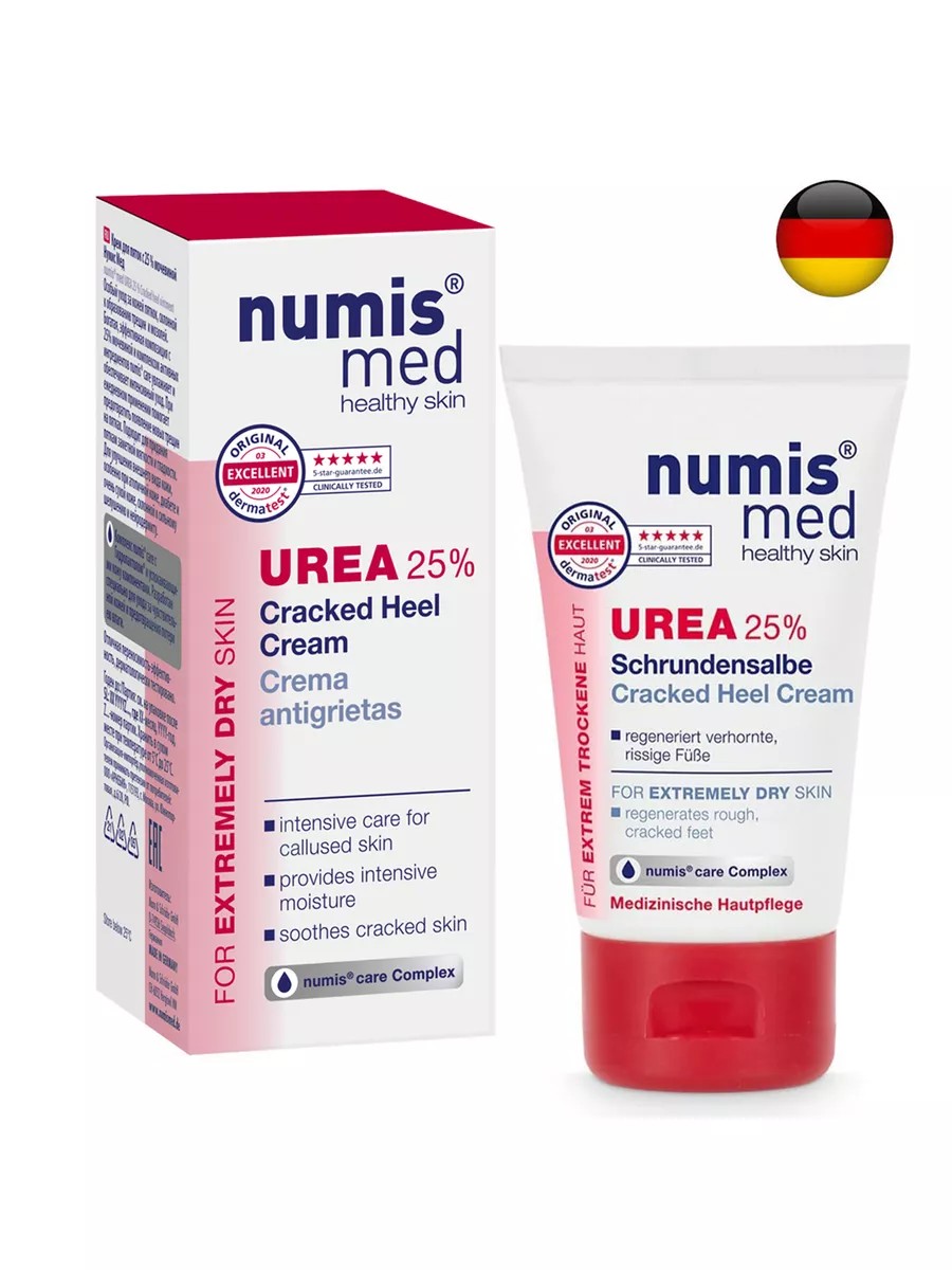 Numis med крем для пяток с 25% мочевиной 50 мл - это особый уход за кожей пяток, склонной к образованию трещин и мозолей. Богатая, эффективная композиция с 25% мочевиной и комплексом активных ингредиентов numis care увлажняет и обеспечивает интенсивный уход. При ежедневном применении помогает предотвратить появление новых трещин на пятках. Подходит для придания пяткам заметной мягкости и гладкости. Для улучшения внешнего вида кожи, особенно при атопичной коже, диабете и очень сухой коже, склонной к сильному шелушению и нейродермиту. Разработан специально для ухода за чувствительной кожей и предотвращения потери ею влаги. Ежедневно наносите достаточное количество крема и массируйте до впитывания. нанести достаточное количество крема и деликатно массировать до впитывания.